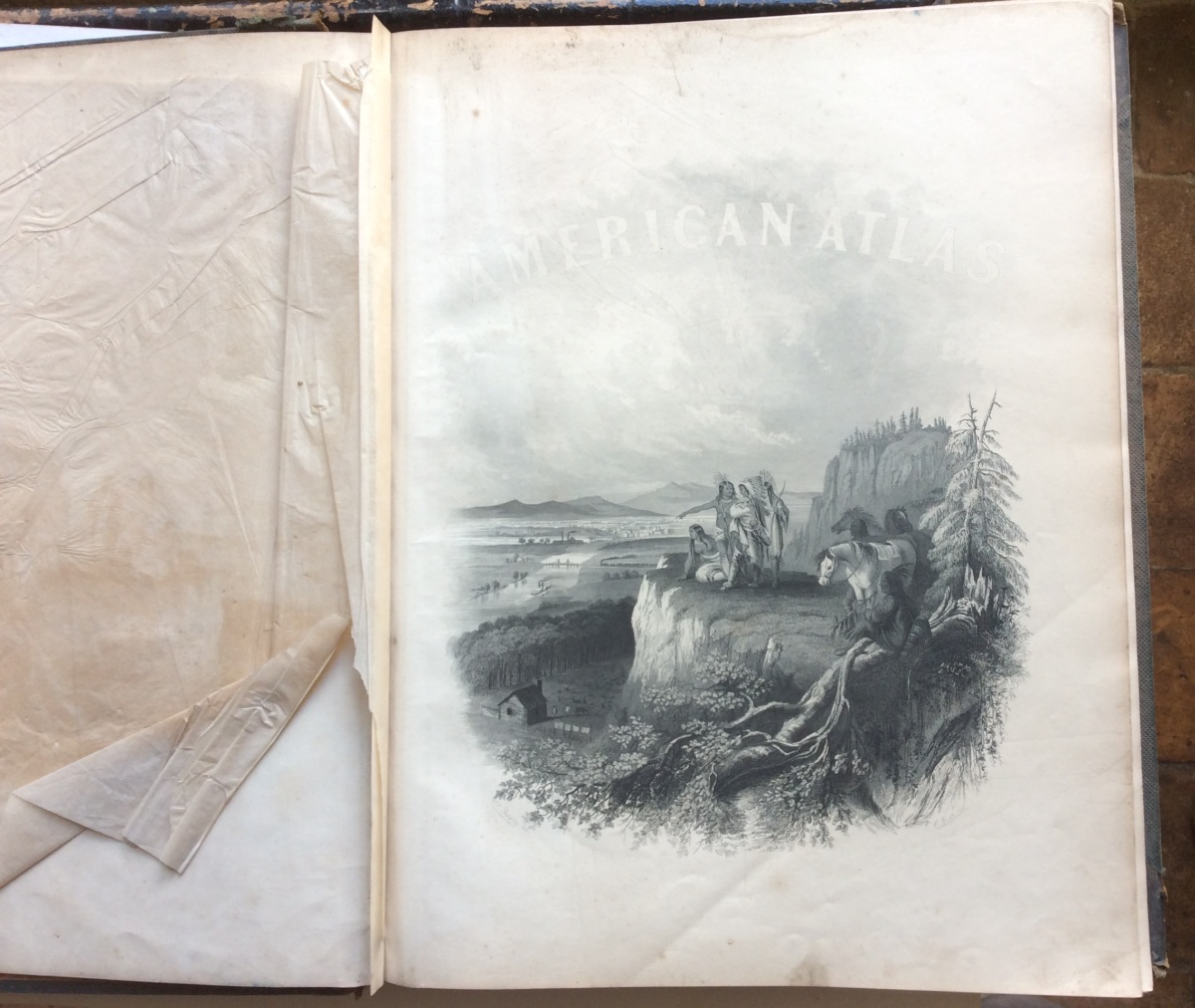 Titre-frontispice en noir et blanc pour l'American Atlas, représentant des Indiens sur un promontoire rocheux. 99 pages de texte, ornées de très nombreuses vignettes gravées sur acier.