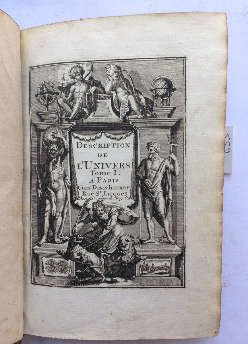 Description de l'Univers contenant les différents systèmes du monde, les cartes générales et particulières de la géographie ancienne et moderne: les plans et les profils des principales villes et des autres lieux plus considérables de la terre, avec les portraits des souverains qui y commandent, leurs blasons, titres et livrées: et les moeurs, religions, gouvernemens & divers habillemens de chaque nation ...