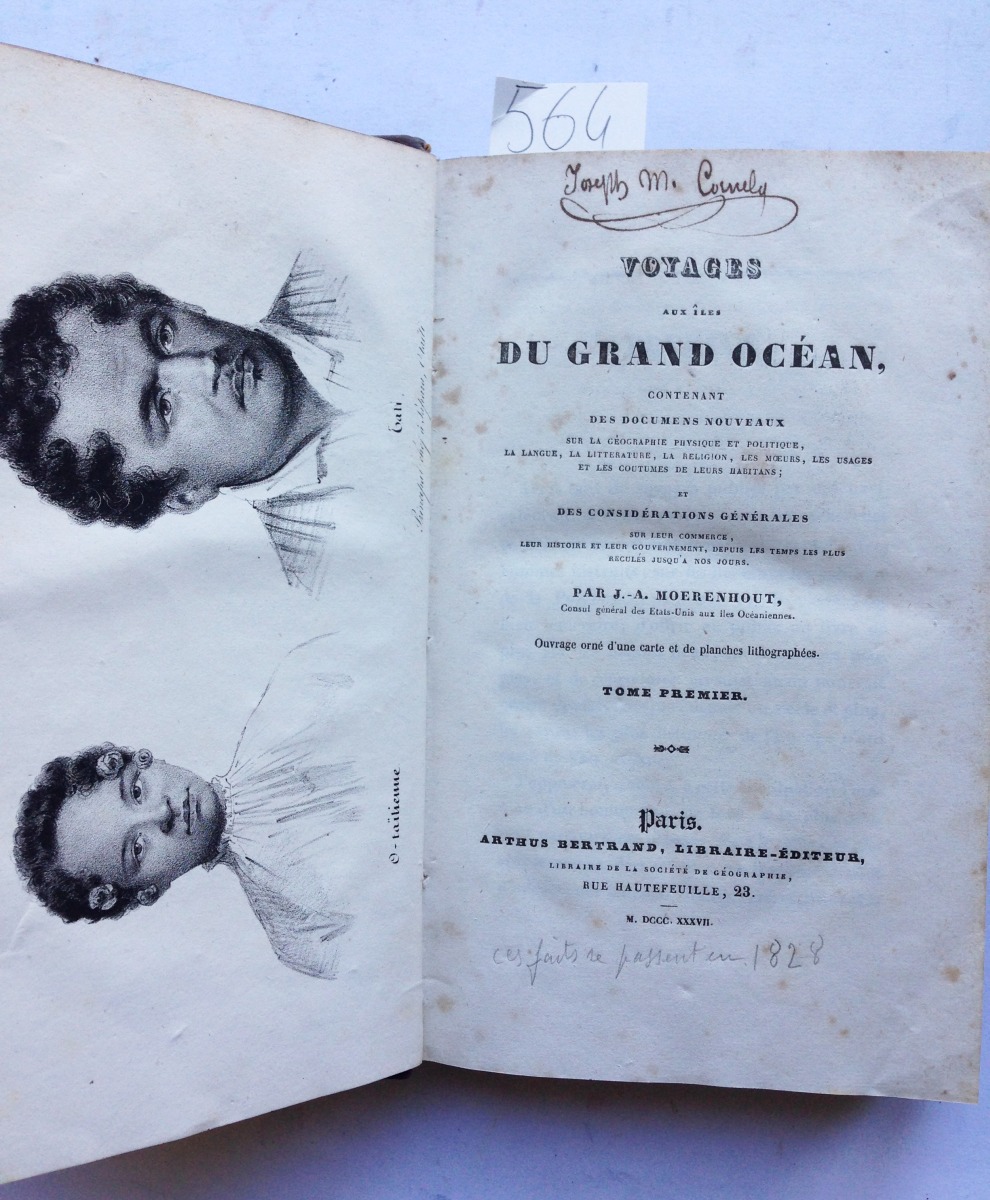 Jacques-Antoine Moerenhout (1796-1879), diplomate, explorateur et ethnologue franco-belge, séjourne de 1829 à 1834 en Polynésie, où il espère installer une culture d'huitres perlières et de nacres. Il visite Pitcairn, les Touamotou, l'Ile de Pâques, les Gambier, les Iles de la Société, et termine son périple à Tahiti, où il devient consul des Etats-Unis.