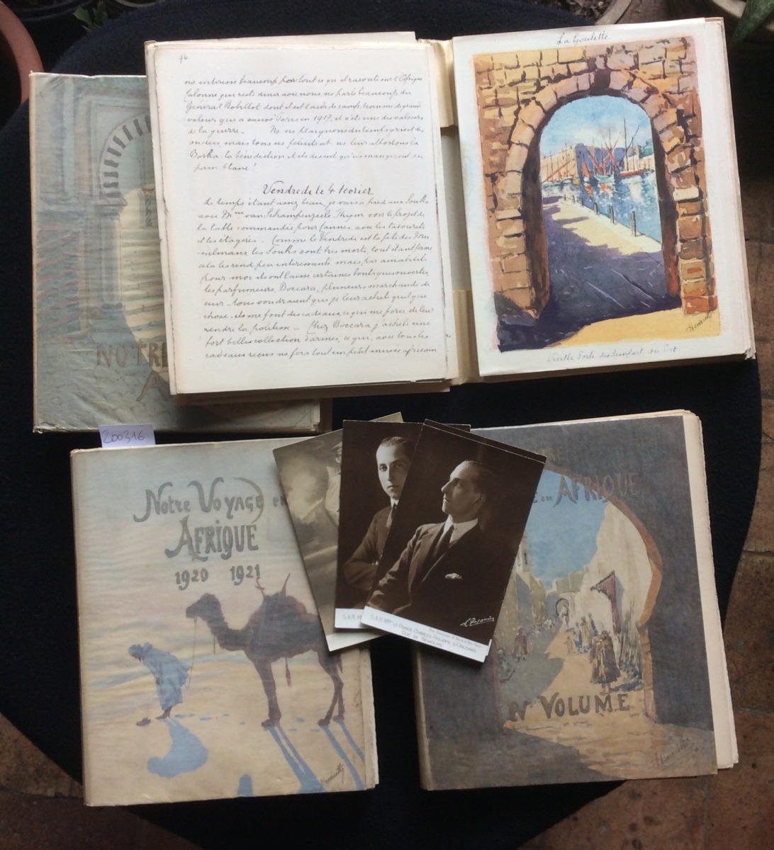Ce voyage dure de novembre 1920 à mars 1921. La duchesse en donne une relation pleine de pittoresque, qu'elle enrichit tout au long de son périple de remarquables aquarelles prises sur le vif. Sont jointes 4 photographies du duc de Nemours et du duc de Vendôme, signées Taponier, avec cachet gras.