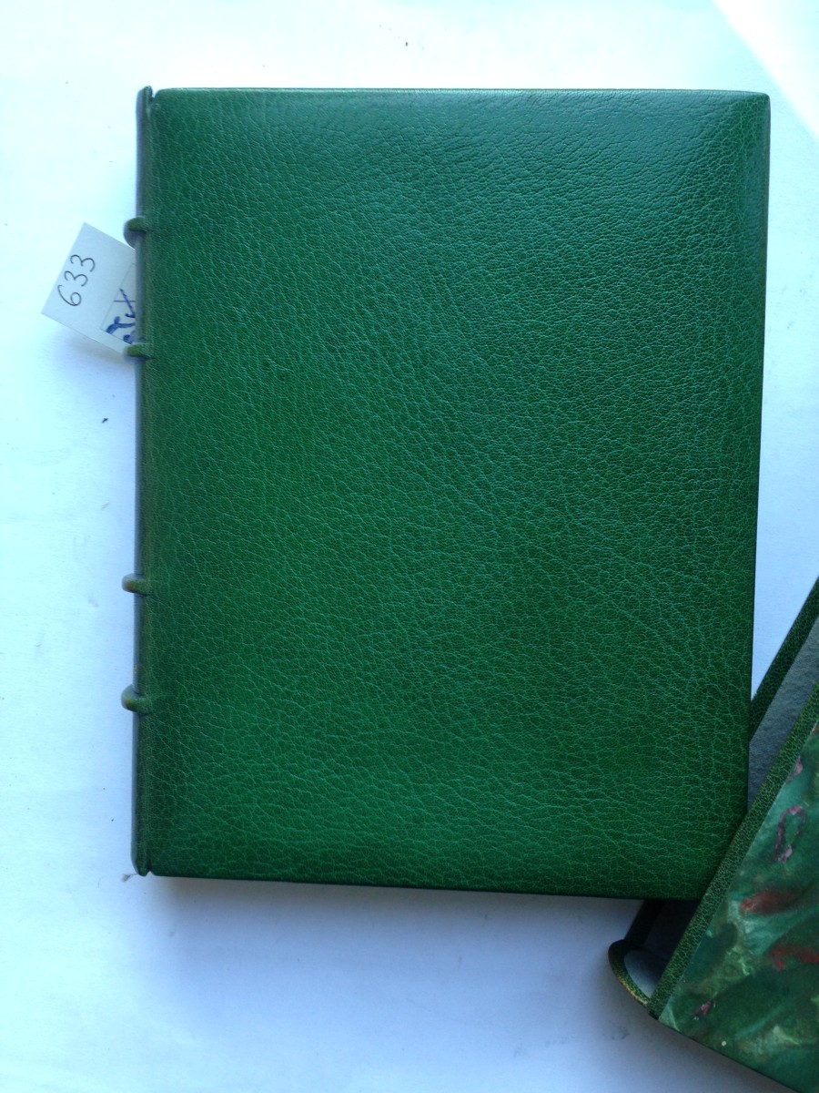 In-4°. Plein maroquin janséniste vert ; doublure de maroquin violine, encadrée par une bande de maroquin vert, au centre de laquelle est inséré un cuivre original. Doubles gardes, la première garde volante en tissage de soie. Toutes tranches dorées sur témoin. Etui bordé de maroquin vert. Reliure du temps, signée Blanchetière., actif à Paris de 1906 à 1935. (Décoloration à peine perceptible du dos).