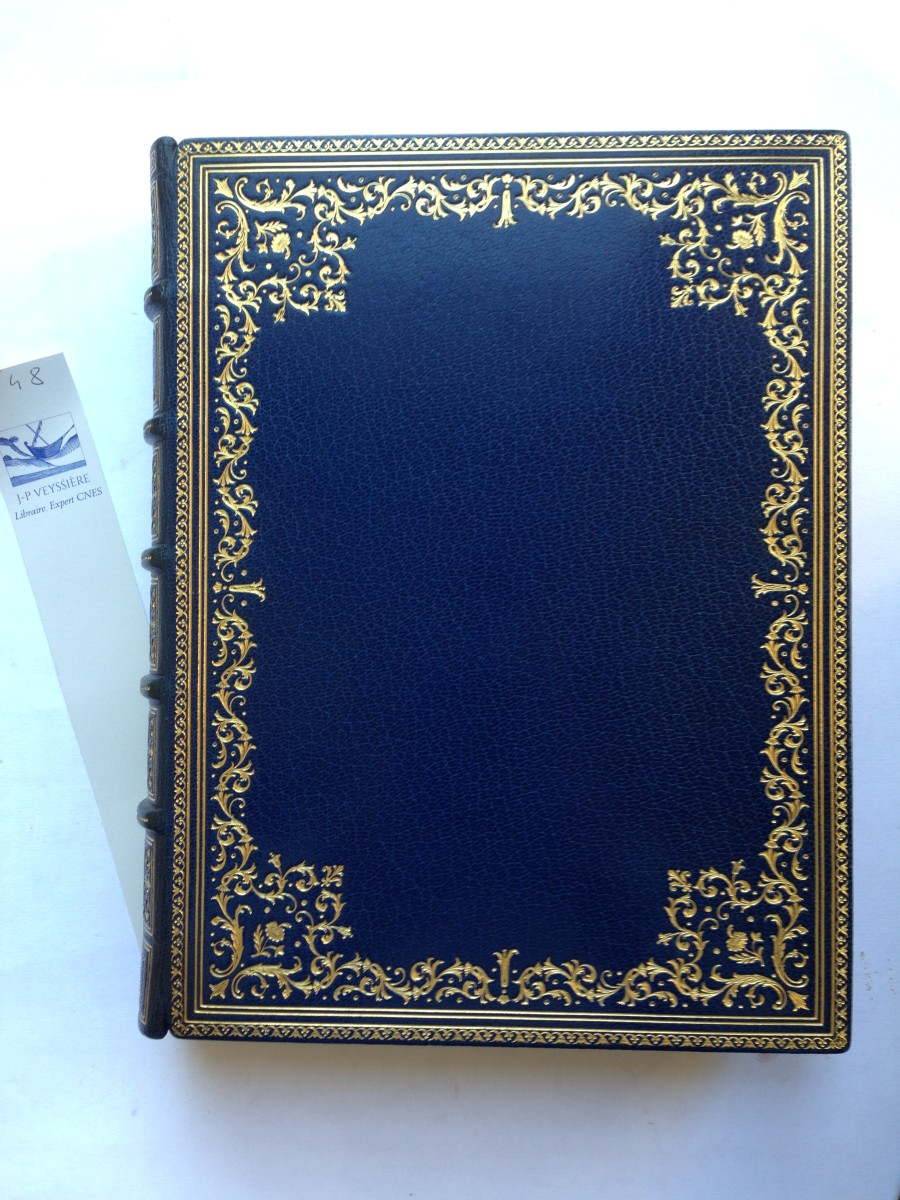 In-4°, plein maroquin bleu-nuit. Encadrement composé d'une roulette de pampres et de 3 filets droits. dans lequel s'inscrit un riche décor poussé aux petits fers dans le goût des maîtres du XVIIIème siècle. Dos à 5 nerfs, richement orné dans les compartiments, avec filet aux pointillés sur les tranches. Double filet droit sur les coupes. 6 filets d'encadrement intérieur, dont deux aux pointillés qui sont liés dans les angles par un décor rocaille aux petits fers. Gardes de moire bleu-marine. Toutes tranches dorées. Couvertures et dos conservés. Reliés en fin d'ouvrage, les 4 feuillets de souscription. Etui bordé de maroquin bleu-nuit. Reliure signée Canape R.D., et datée 1914 sur le second contre-plat.
