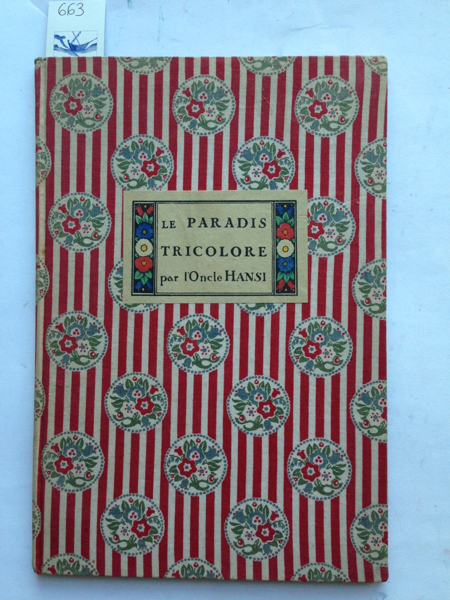 Petit in-folio (310 X 210 mm). Toile fine à bandes verticales rouges et blanches, titre sur une étiquette illustrée sur le premier plat, gardes illustrées d'un dessin en couleurs de Hansi, sur double page. Tranches rouges. Reliure de l'éditeur.