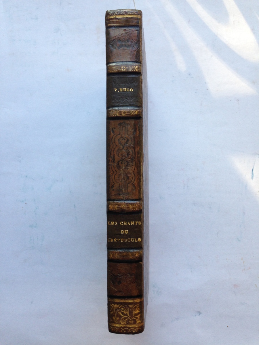 In-8, 1/2 veau olivâtre du temps, décor à frod et à chaud sur le dos. (La pièce de titre d'origine "V. Hugo. Poésies" a été remplacée par une pièce portant uniquement le nom de l'auteur ; une pièce de titre a été placée dans un des caissons inférieurs).