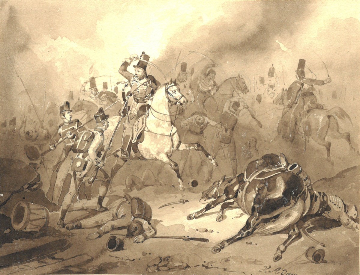 Victor ADAM (Paris 1801 - 1866)Choc de cavalerieLavis brun. Signé...