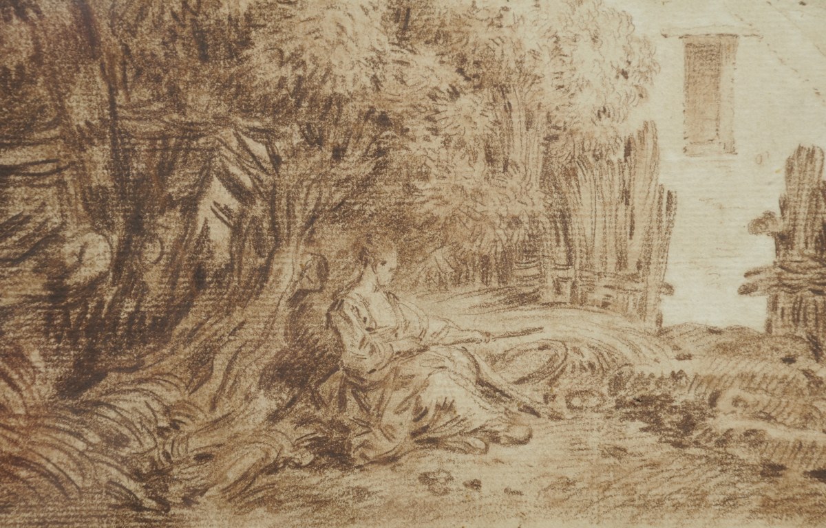 Pierre brune, estompe signée et datée en bas à droite "JB Huet 1775".