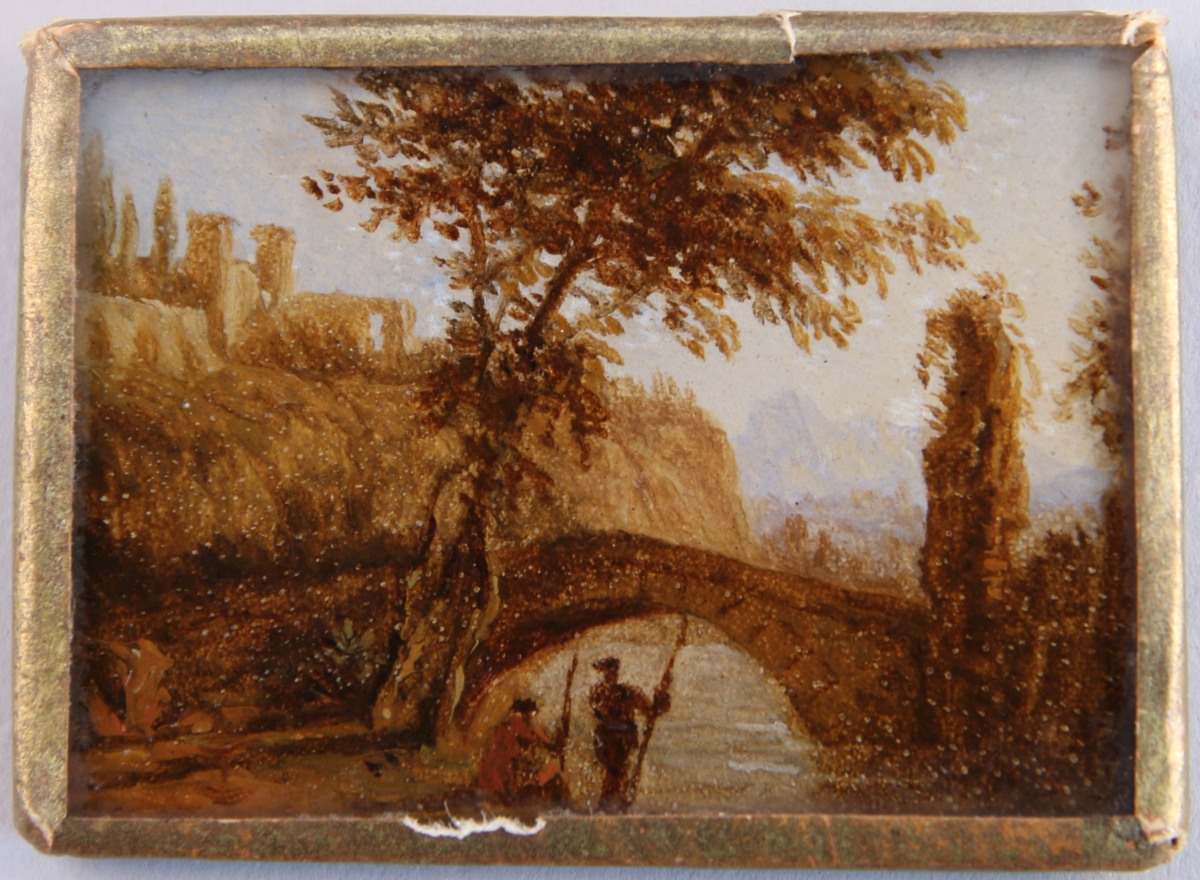 Paysage au pont animé de deux personnages.