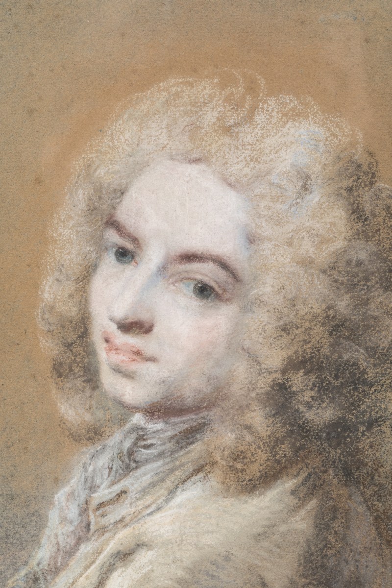 Notre pastel n'est pas celui que Rosalba Carriera effectue pour Crozat, puisqu'il s'agit de celui conservé à Trieste (Museo di Santa Caterina, inv. P.190) et identifié par Cailleux en 1966. La feuille peut être néanmoins rapprochée d'une étude préparatoire conservée à Francfort (Städelsches Kunstinstitut). Bernadina Sani note que la pose et l'expression ne sont pas caractéristiques du travail de Rosalba Carriera, ce qui pourrait amener à penser qu'il ne s'agit pas d'une étude d'après nature mais d'après des dessins de Watteau lui-même. Notre pastel pourrait donc être un témoignage rare du travail de la pastelliste où elle s'intéresse particulièrement à la physionomie du personnage. Pour Sani, ce pastel et son étude préparatoire sont une réflexion sur les techniques stylistiques de Watteau. Ce dernier rendait en effet compte des sentiments dans son uvre, et Rosalba ici se fait l'interprète de cette nouvelle sensibilité. Nul doute que la Vénitienne fut séduite par Watteau, elle exprime toute sa reconnaissance dans une lettre à Jean de Julienne où elle parle de " l'inimitable Vato ".