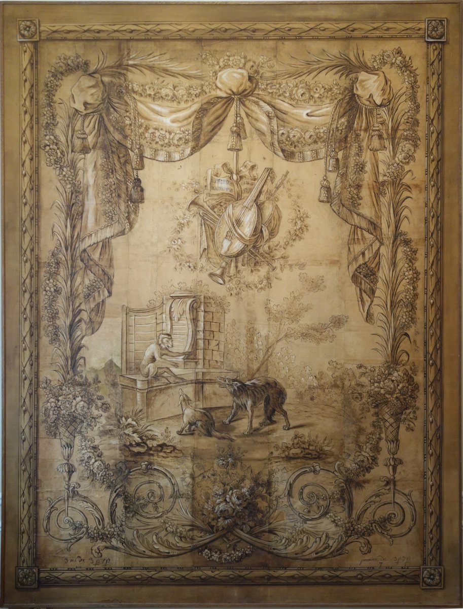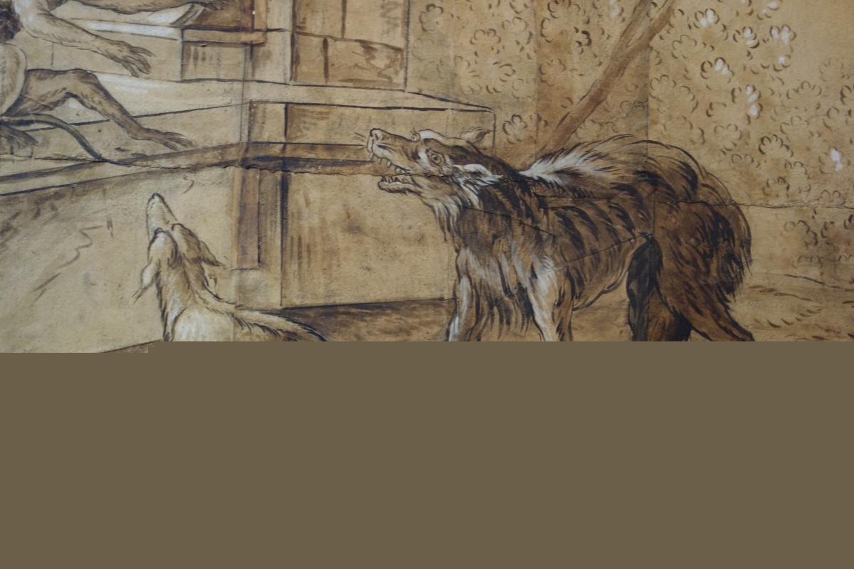 Workshop of Jean-Baptiste OUDRY. The Wolf pleading against the Fox before the Monkey. Brush and black ink, brown ink, black pencil, sanguine traces and white gouache highlights on numerous sheets assembled and mounted on canvas.