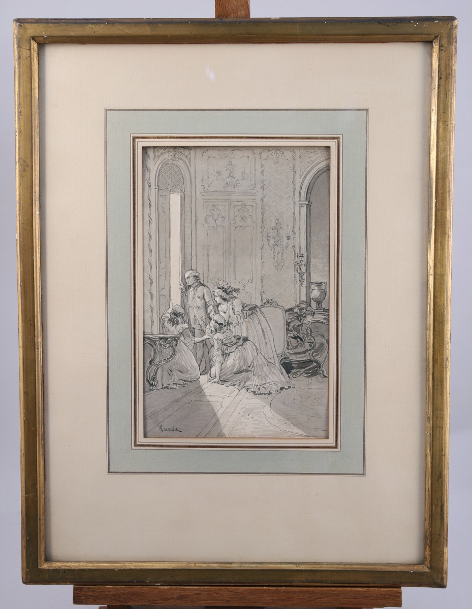 École FRANÇAISE du XIXe.Aristocrates guettant l'arrivée des révolutionnaires. Lavis signé...