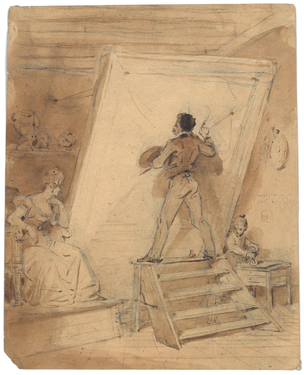 Une réunion de 5 dessins (un paysage et trois scènes de genre et un peintre dans son atelier).