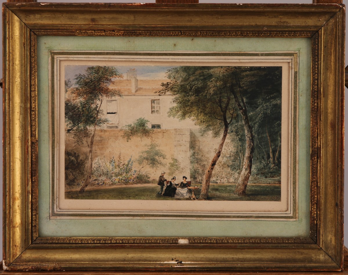 JOINT: École du XIXe. Conversation dans un parc. Aquarelle signée et datée en bas à droite. Haut. 10,5, Larg. 17 cm.