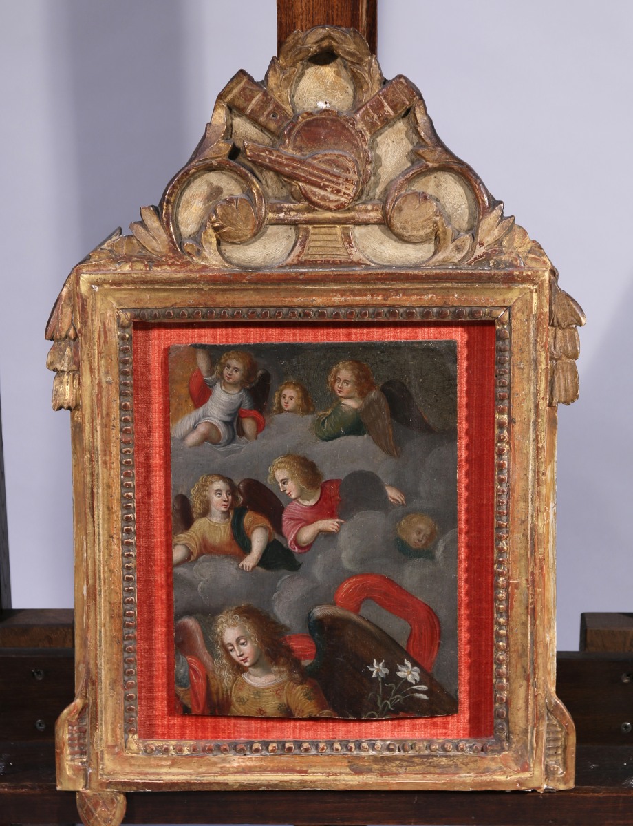 École FLAMANDE du XVIIe.Anges de l'Annonciation. Panneau (fragment). Haut. 27,...