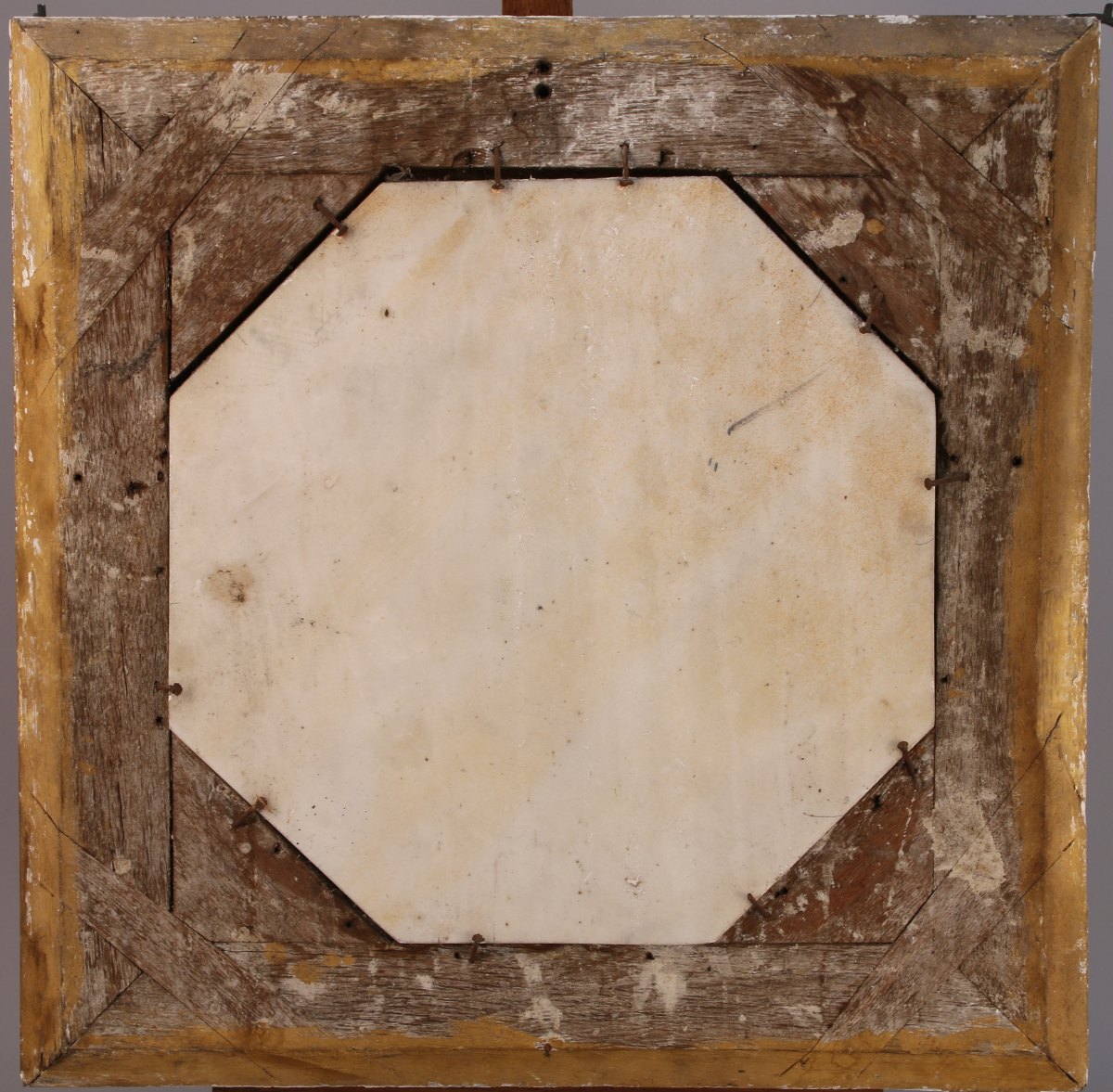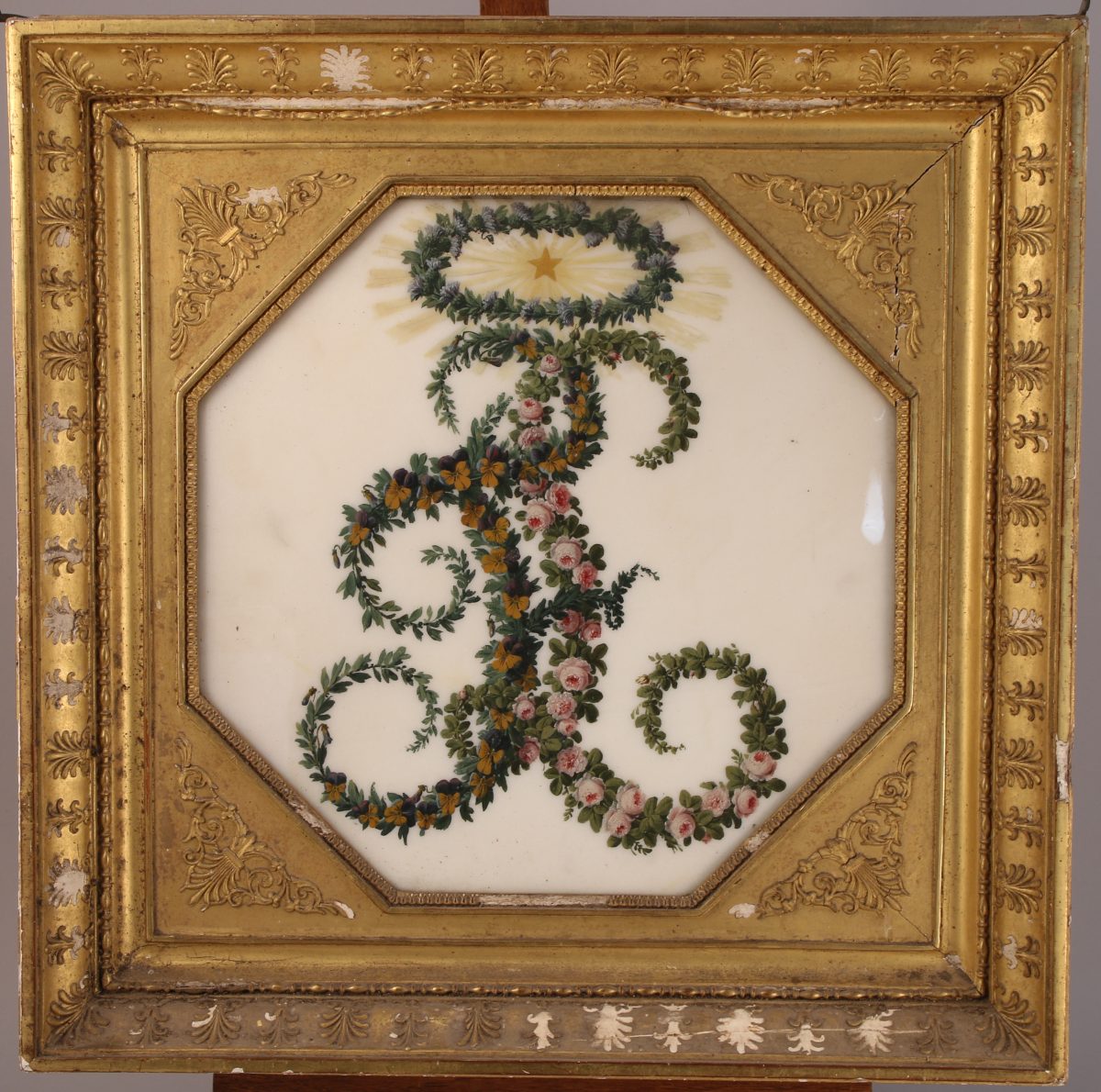 Monogramme "FL" peint sur une plaque de marbre blanc de forme octogonale. Le monogramme est constitué de guirlandes de fleurs entrelacées. Le "F", de pensées; le "L" de roses. Le monogramme est timbré d'une couronne de bleuets centrée d'une étoile rayonnante.