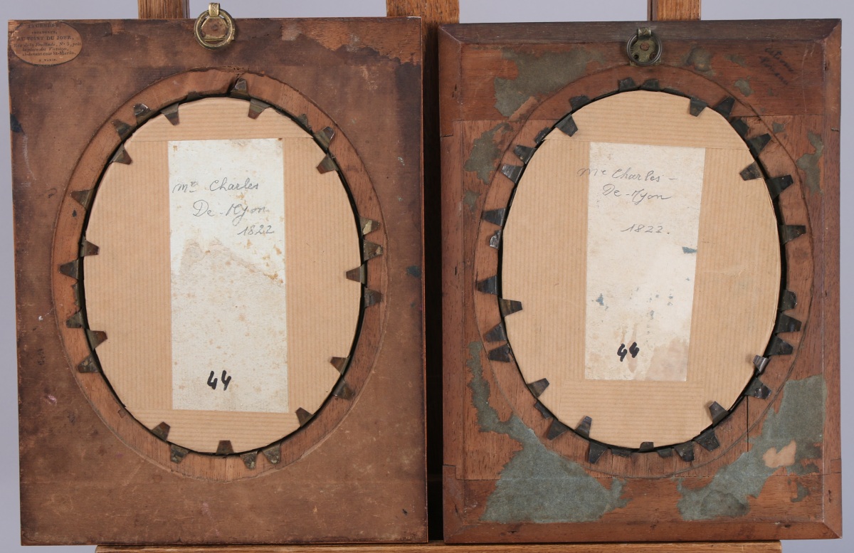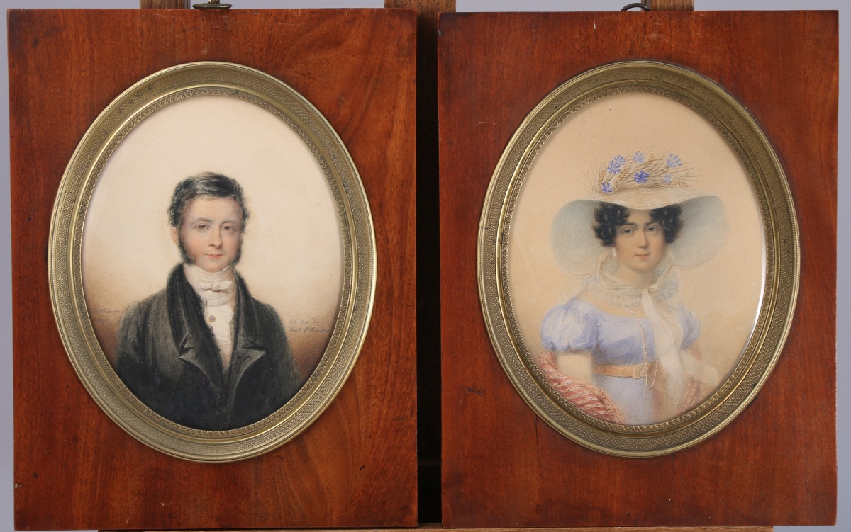 JOINT: L. W. THOMSON, Portrait de Charles de MYON et de son épouse, Deux dessins au crayon signés, celui du mari daté 1822 et inscrit 68 rue du faubourg St Honoré, Haut 16, 3 cm. Il pourrait s'agir du même homme que celui représenté sur toile.