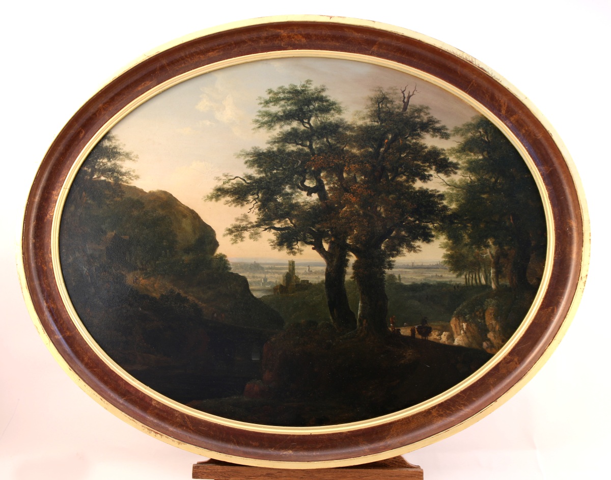 Nicolas-Toussaint CHARLET (1792-1845)Paysage animé.Panneau, format ovale.Haut. 53 Larg. 69,5 cm.