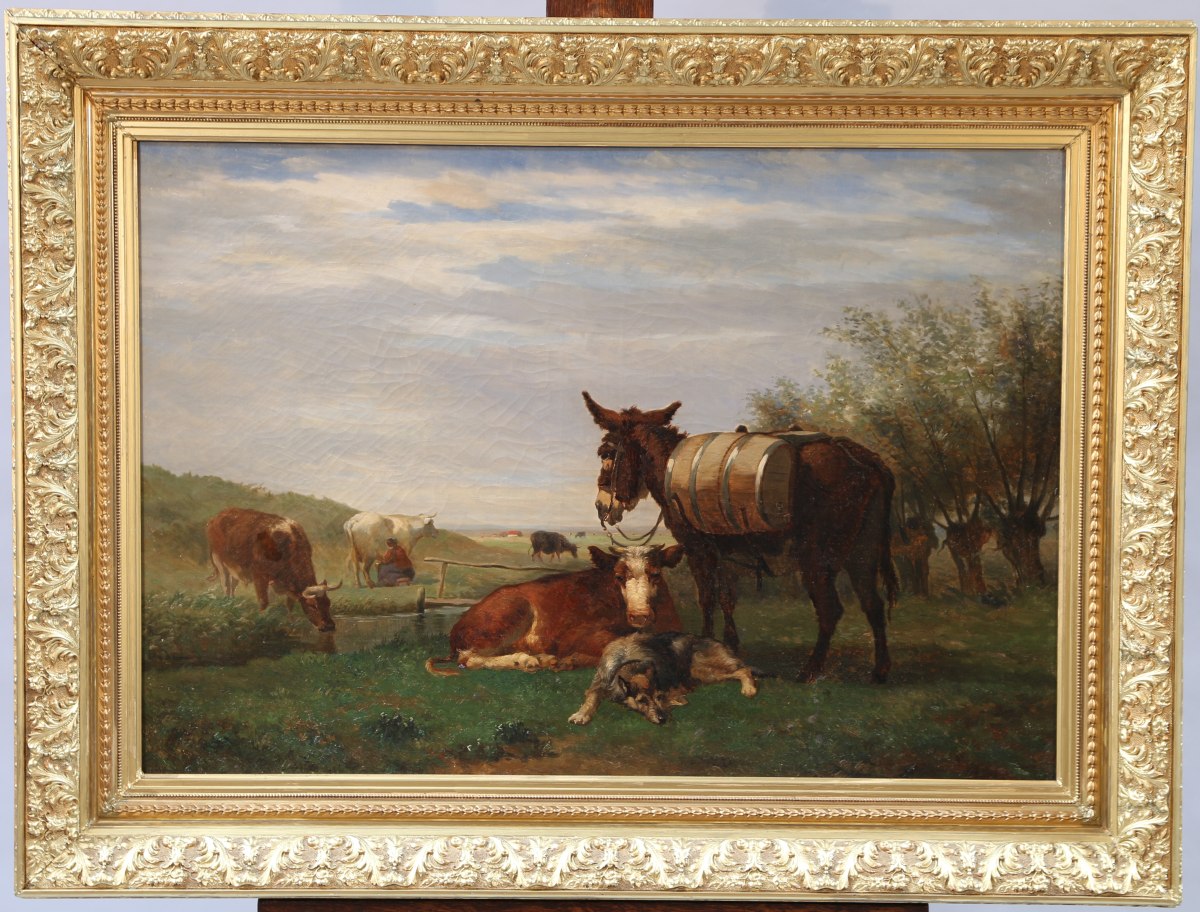 École du XIXe.Âne, vache et chien.Toile.Haut. 63, Larg. 91 cm.