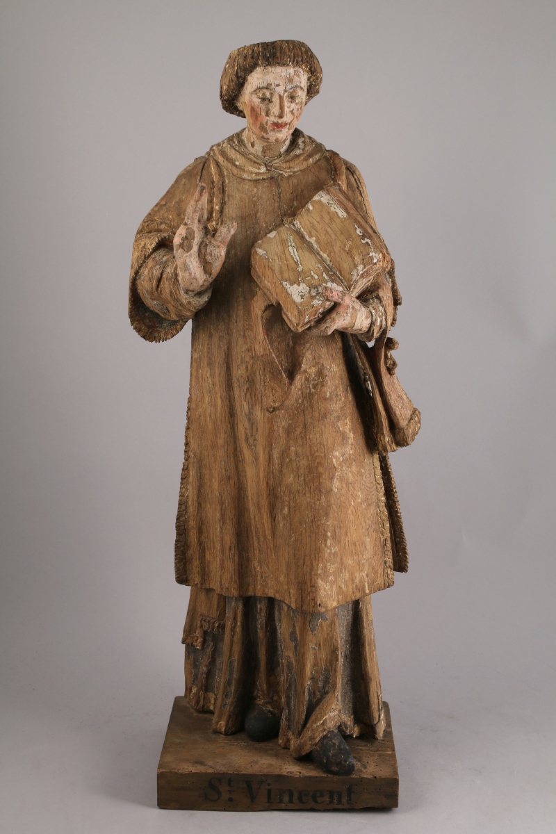 Debout sur un socle rapporté en hêtre, de forme rectangulaire, portant inscription de "St. Vincent".
