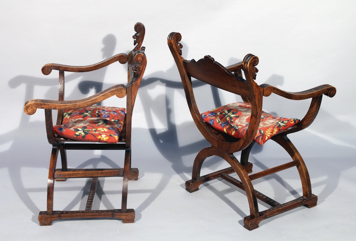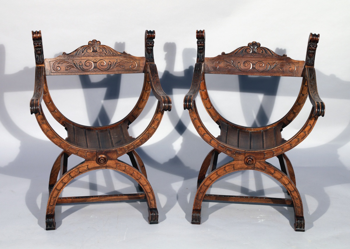 PAIRE de FAUTEUILS curules en bois naturel à dossier bandeau. Les montants du dossier terminés par une tête de lion. Décor sculpté de rinceaux feuillagés et d'acanthes. Ils reposent sur des pieds patins réunis par une entretoise en "H".