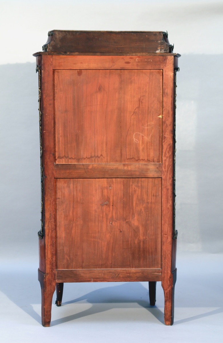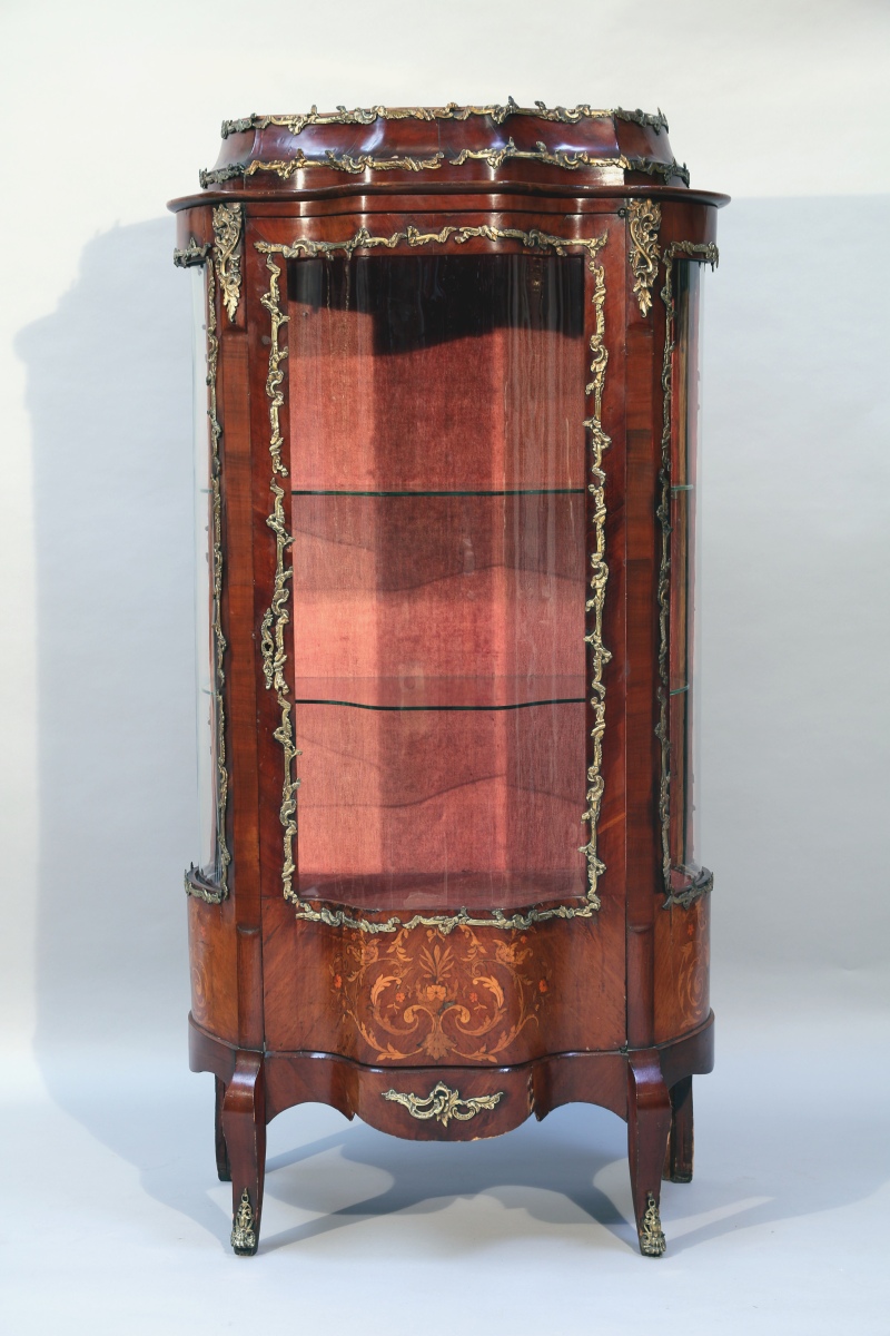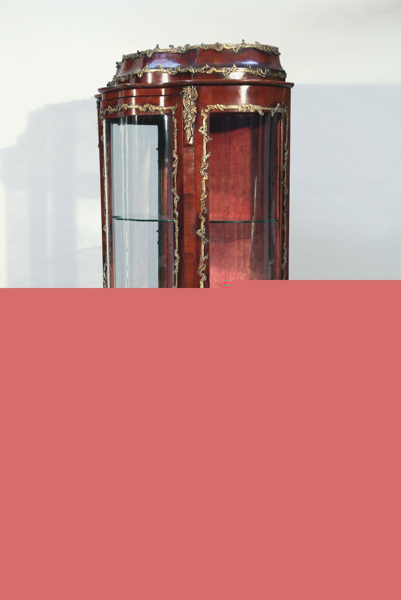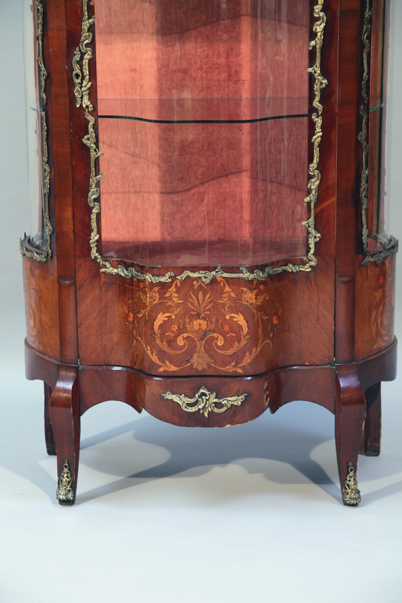 VITRINE galbée en bois de placage, à décor marqueté de bouquets et rinceaux. Elle ouvre en façade par une porte vitrée de forme bombée et découvre un intérieur capitonné de velours cramoisi. Les faces latérales également vitrées et bombées. Ornementation de bronzes dorés figurant des feuillages rocaille et sabots. Elle repose sur quatre pieds, les antérieurs cambrés, les postérieurs droits.