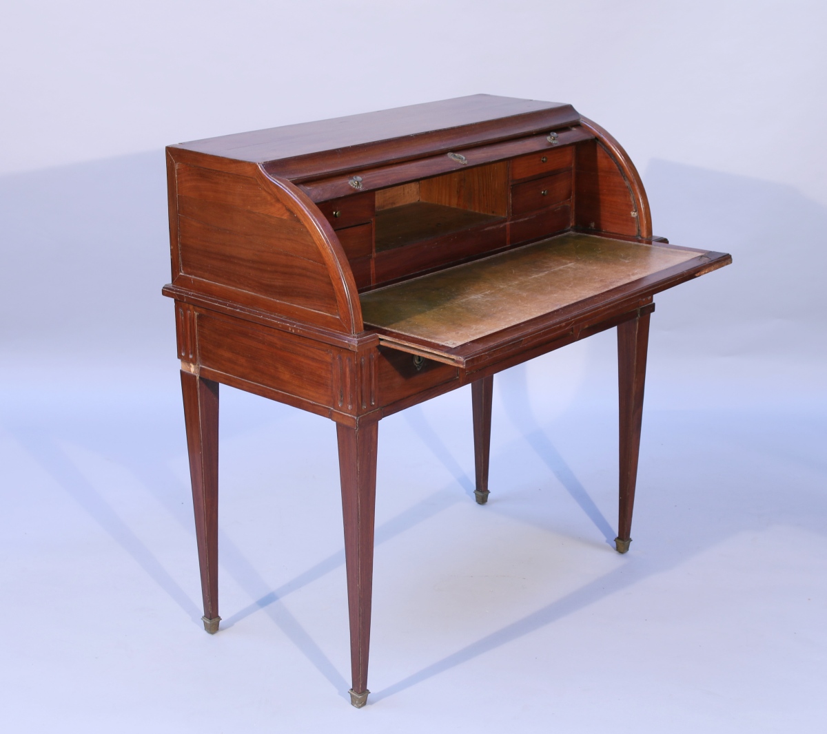 et placage d'acajou ouvrant en façade par trois tiroirs en ceinture et un abatant découvrant quatre tiroirs, un caisson et une tablette coulissante. Garniture de bronzes tels que entrées de serrure, boutons de tirage et sabots. Il repose sur quatre pieds gaine.