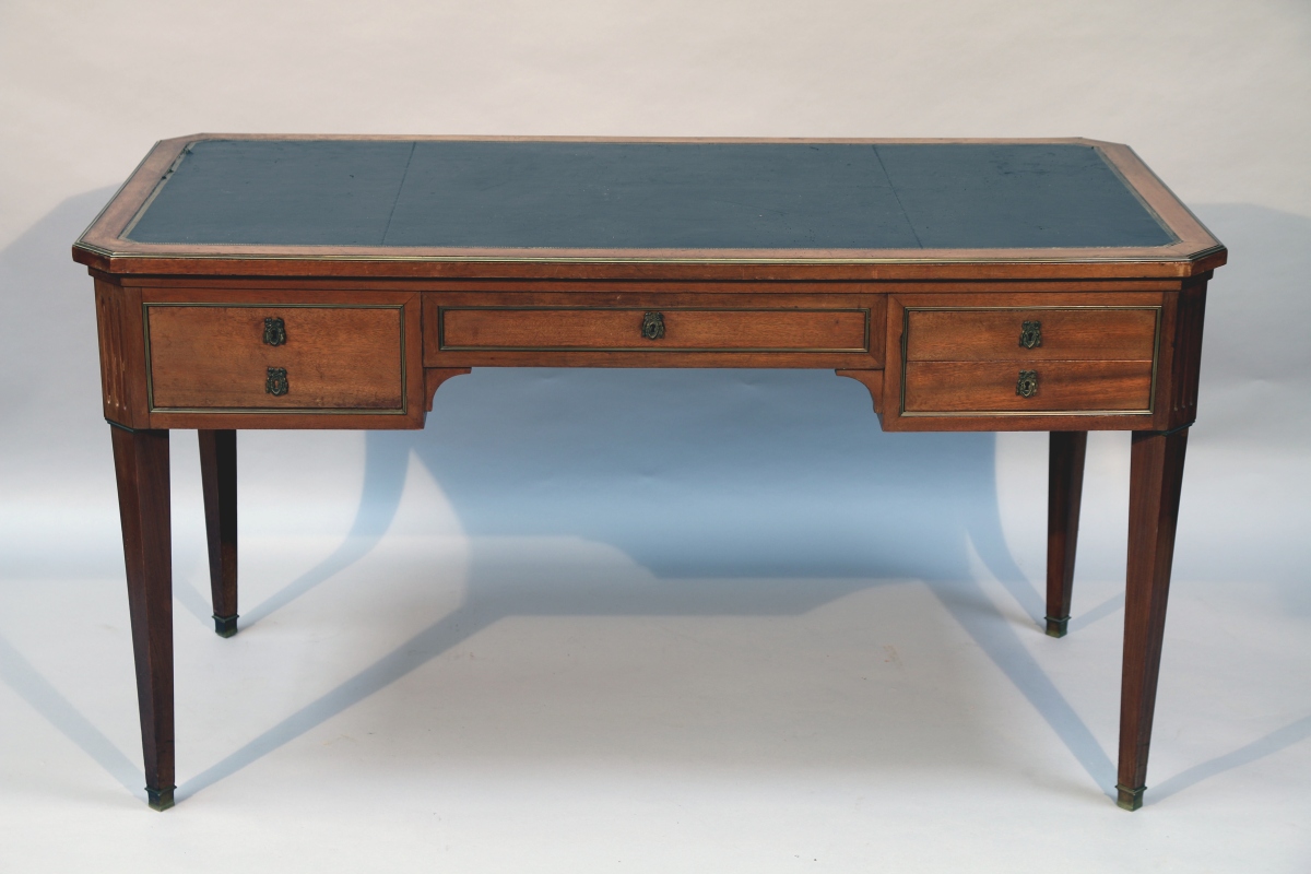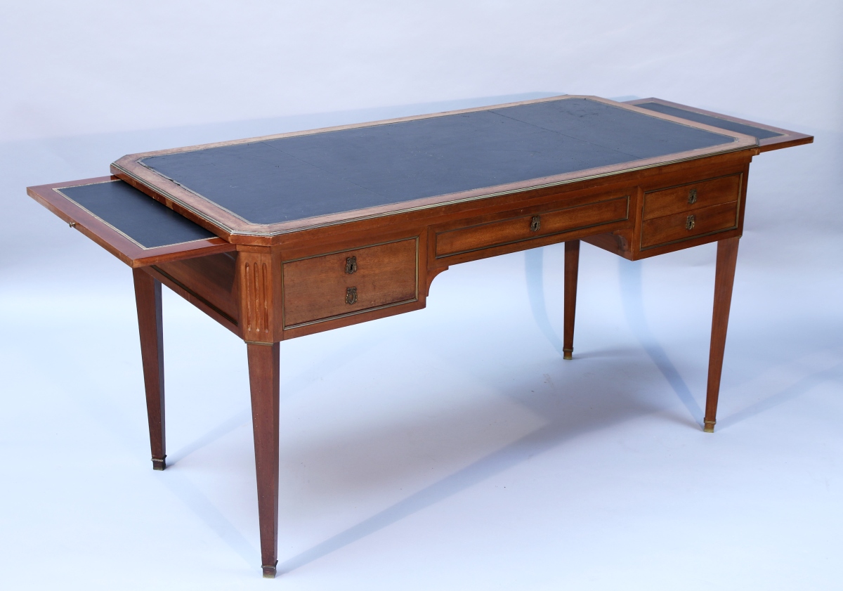en noyer ouvrant en ceinture par quatre tiroirs et deux tablettes latérales. Plateau ceint d'une lingotière foncé de cuir noir. Garniture de bronzes tels que entrées de serrure, baguettes et sabots.
