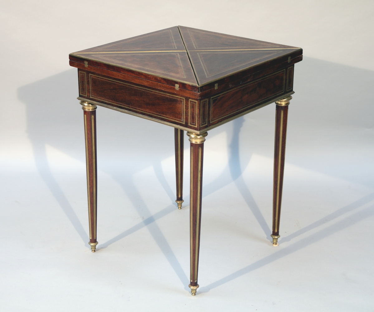 en placage de bois teinté à la façon de l'acajou à encadrements en filets de laiton. Elle ouvre par un tiroir en ceinture et repose sur quatre pieds fuselés bagués de bronze à cannelures garnies de laiton.