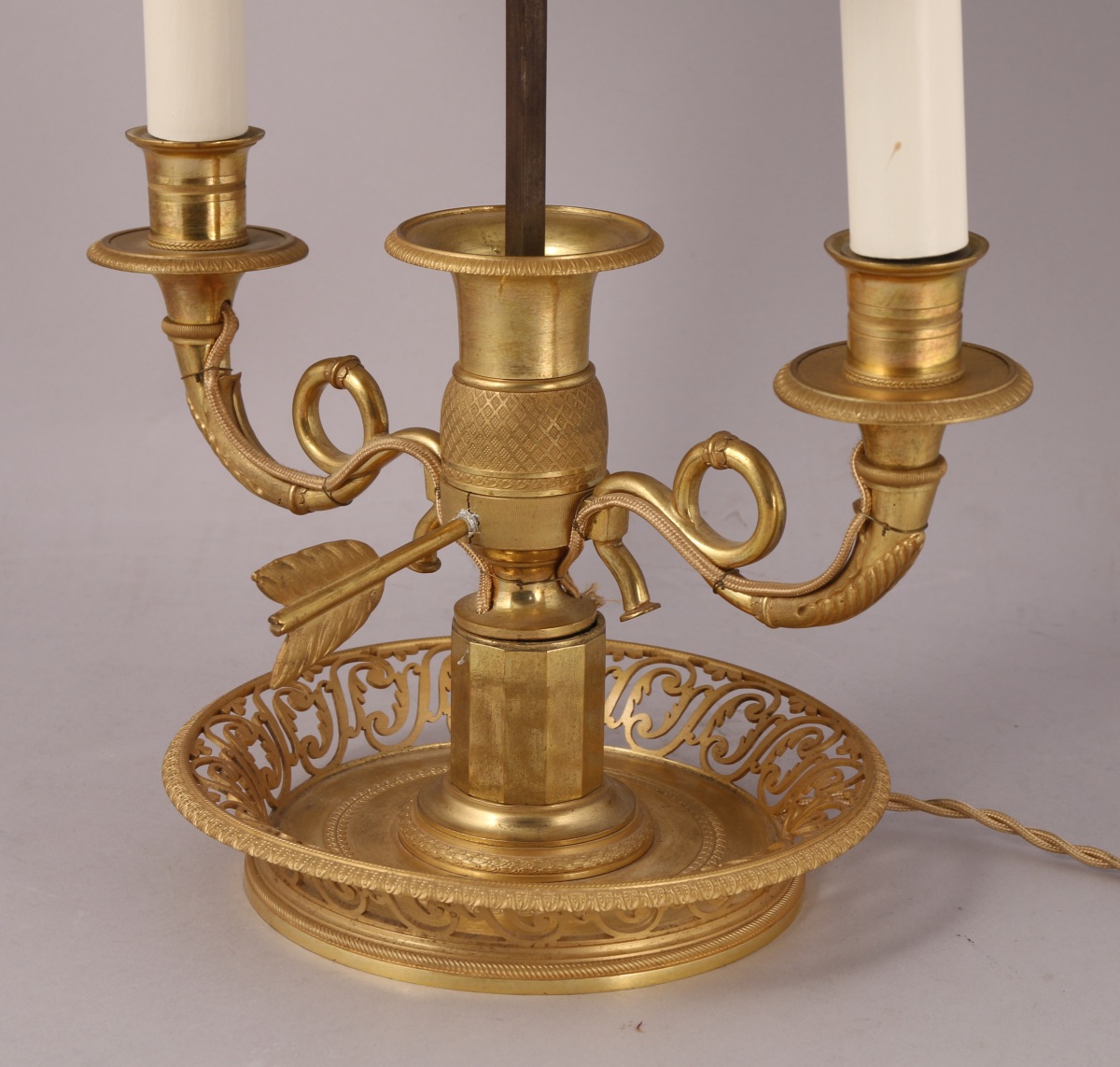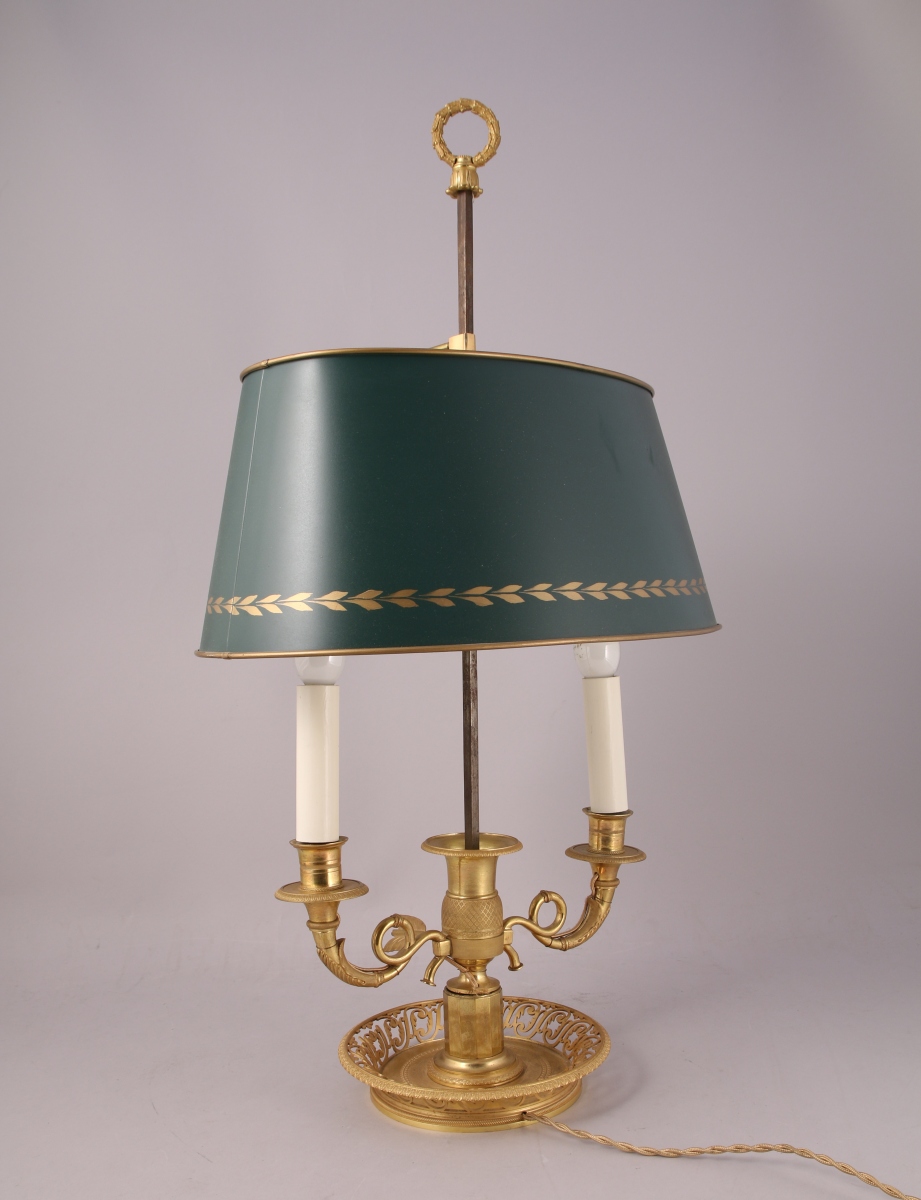 et ciselé, avec un abat-jour en tôle peinte. La base ajourée de volutes feuillagées, le fût cannelé, les bras en enroulements.