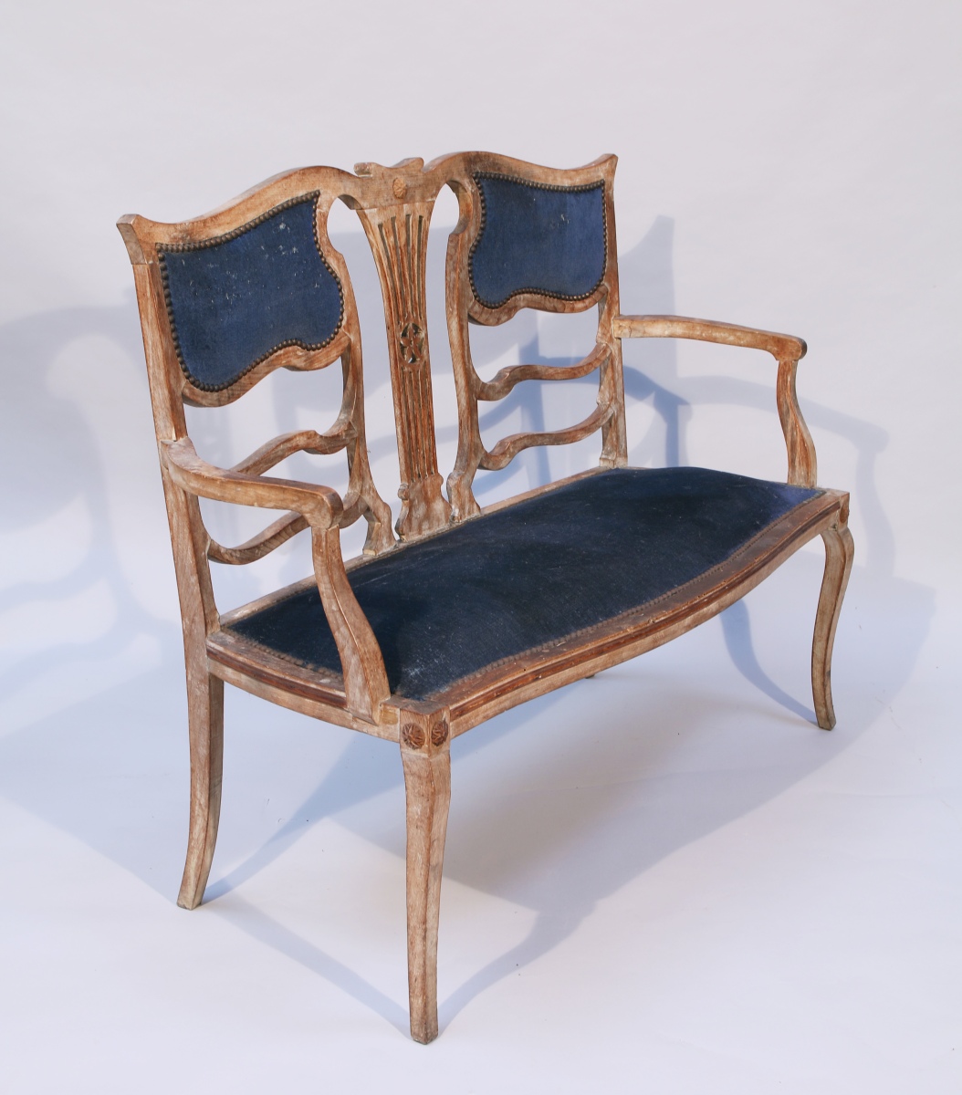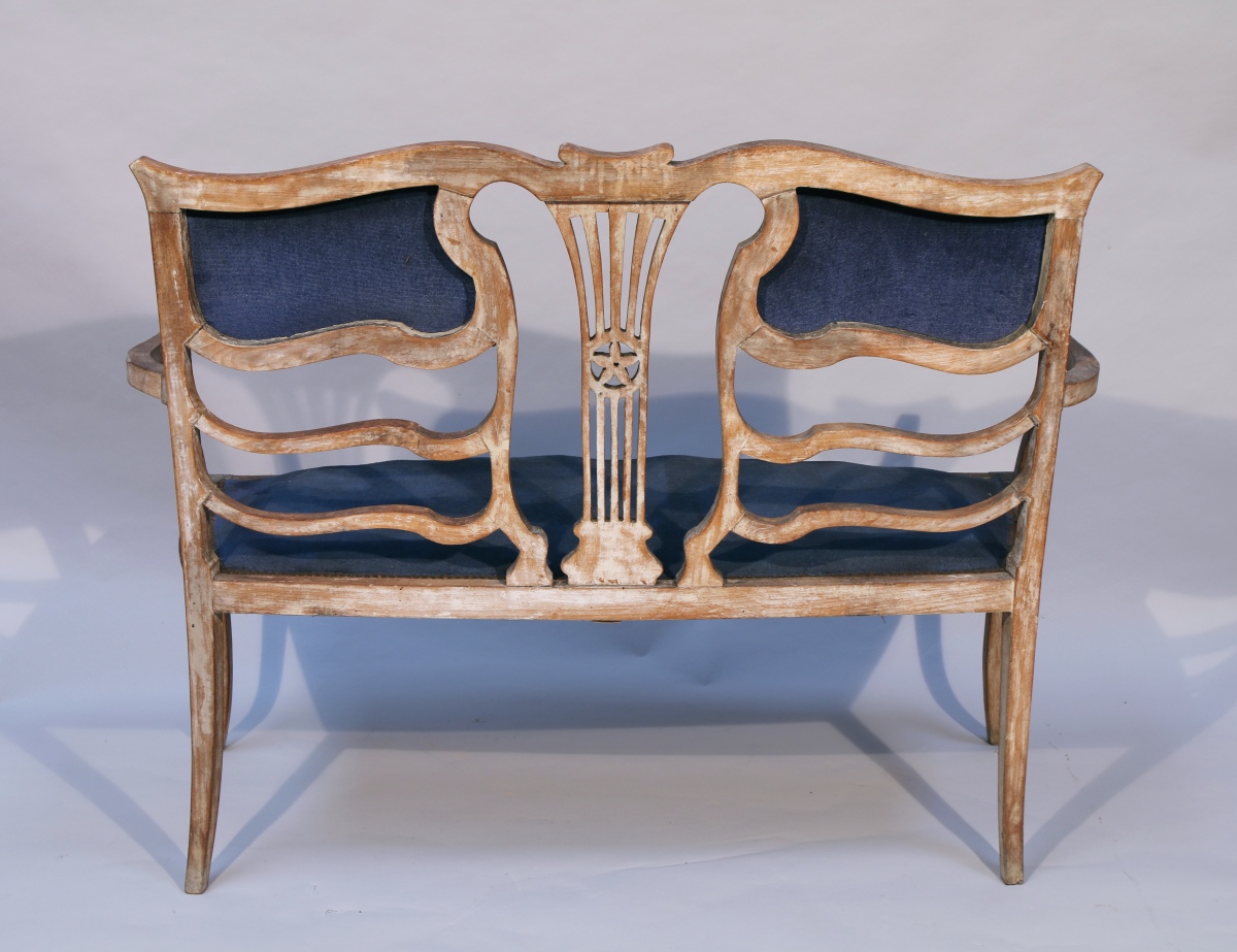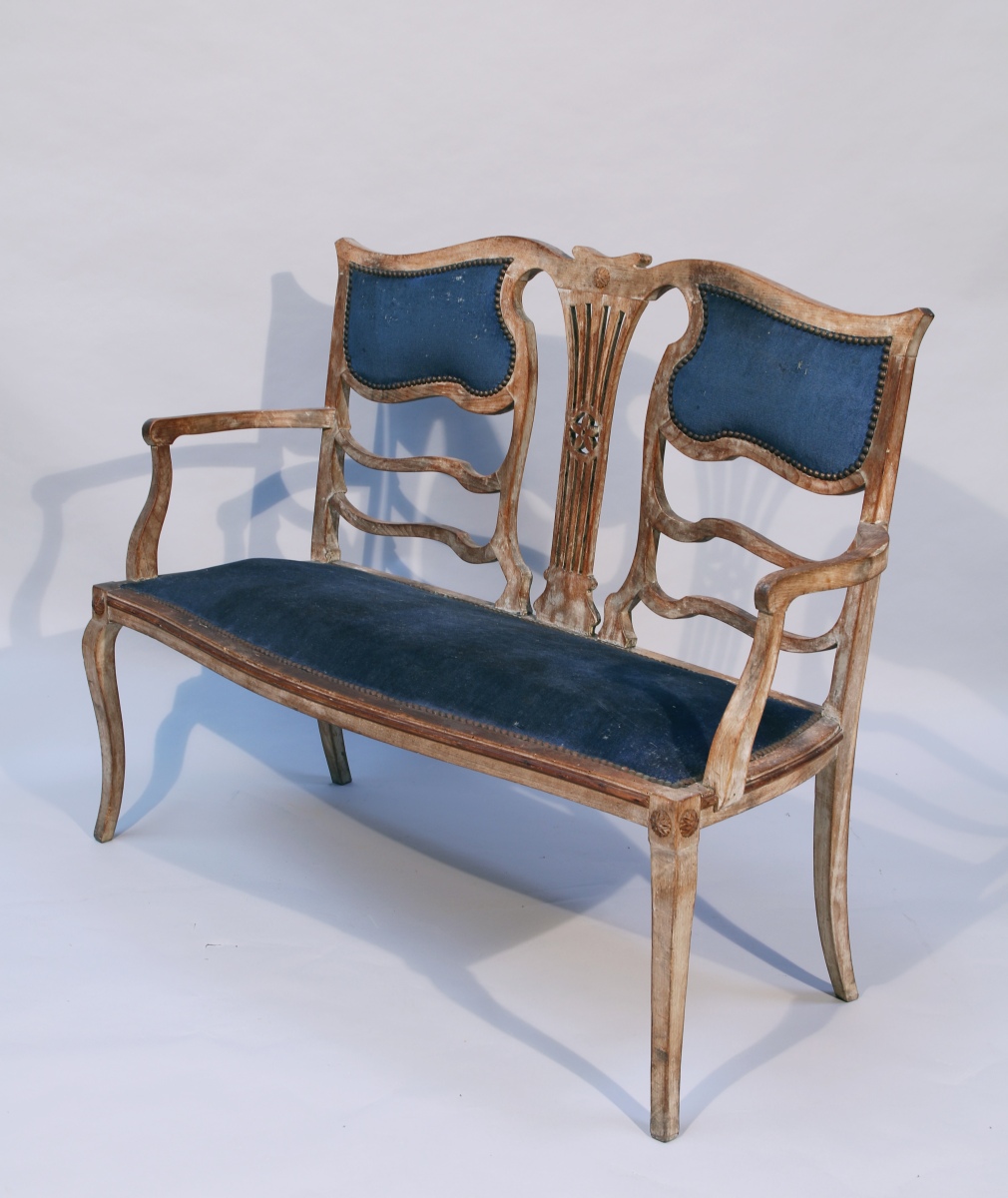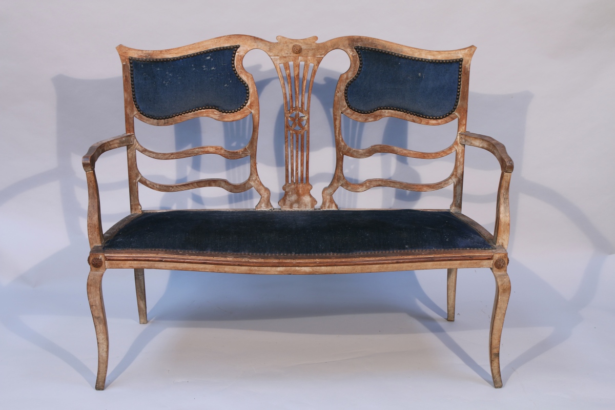 en bois naturel. Dossier ajouré, au centre en forme de lyre, agrémenté d'un fleuron. Accotoirs mouvementés à dés de raccordement à rosace. Elle repose sur quatre pieds, les antérieurs cambrés, les postérieurs sabre.