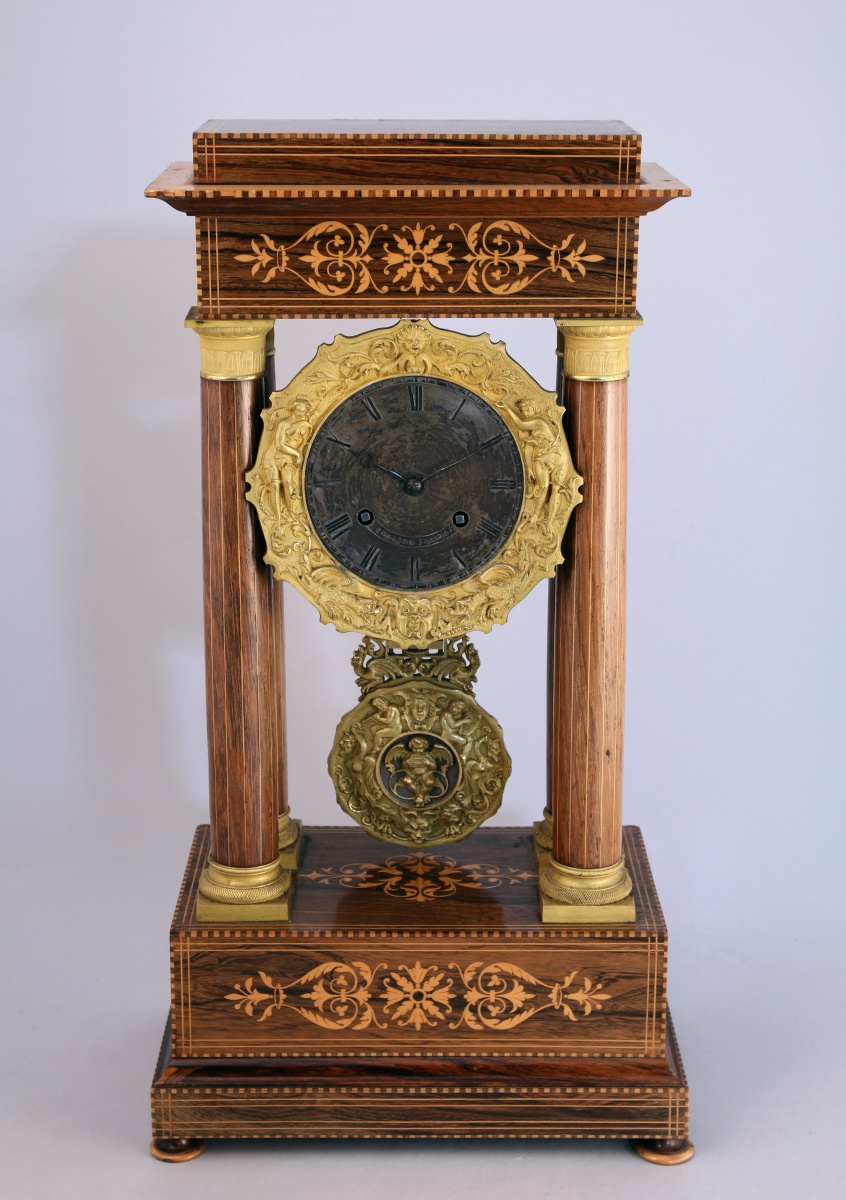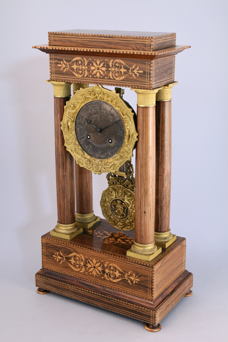 en marqueterie de bois avec filet de citronnier, reposant sur une base rectangulaire (quatre petits pieds en toupies aplaties), le cadran circulaire dans un entourage de femme fleurs encadré par quatre colonnes bombées et réunies au sommet par une terrasse maquettée. Le cadran en acier avec les heures en chiffres romains signé " Villemeain à Nantes ". Balancier compensé.