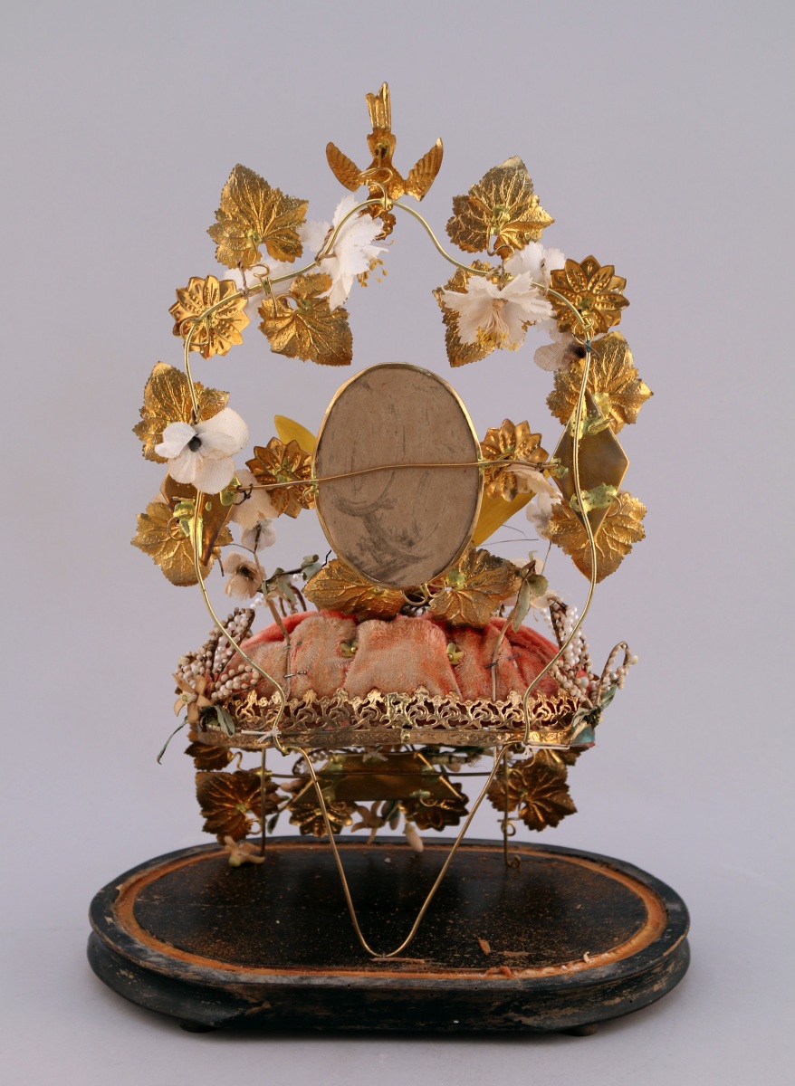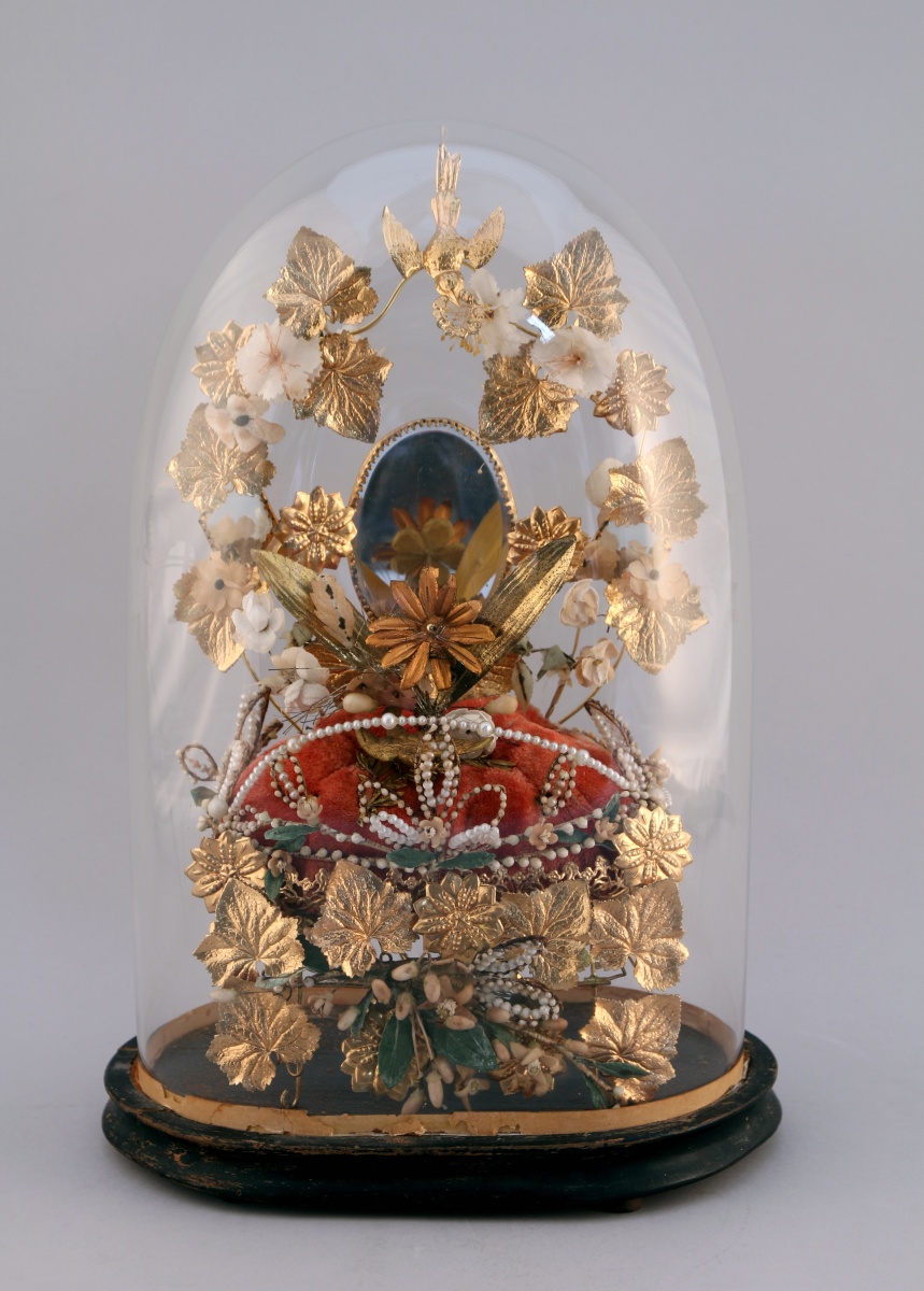 à riche décor de clinquants adoptant la forme de feuilles de vigne, fleurons et colombes articulé autour d'un coussin de velours corail. L'ensemble est agrémenté de fleurs en tissu, branche d'oranger en cire, perles et d'un miroir de forme ovale flanqué de deux miroirs de forme losangique. Le globe repose sur une base de forme ovale en bois noirci.