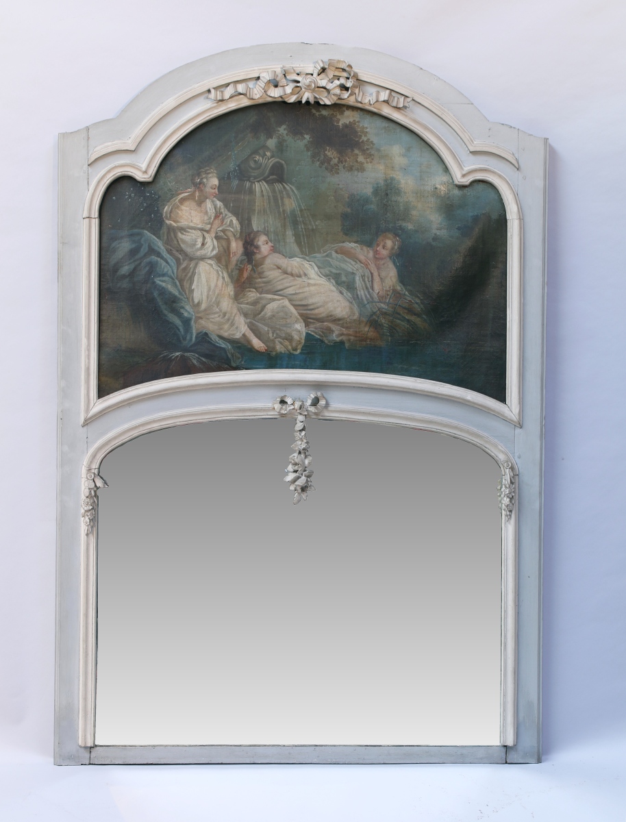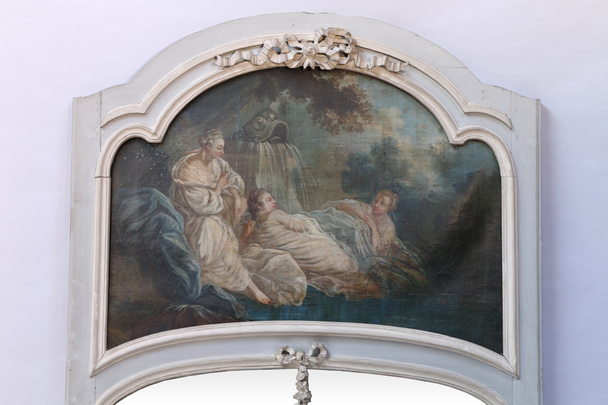 et laqué orné d'un miroir en partie basse et d'une toile figurant trois femmes à la source en partie haute. Peinture dans le goût des pastorales du XVIIIe: trois femmes en chemise dans la nature avec une fontaine à tête de dauphin d'où jaillit la source.