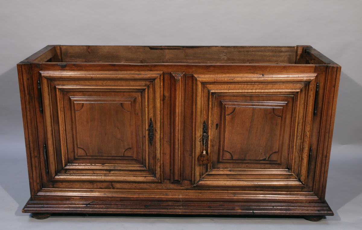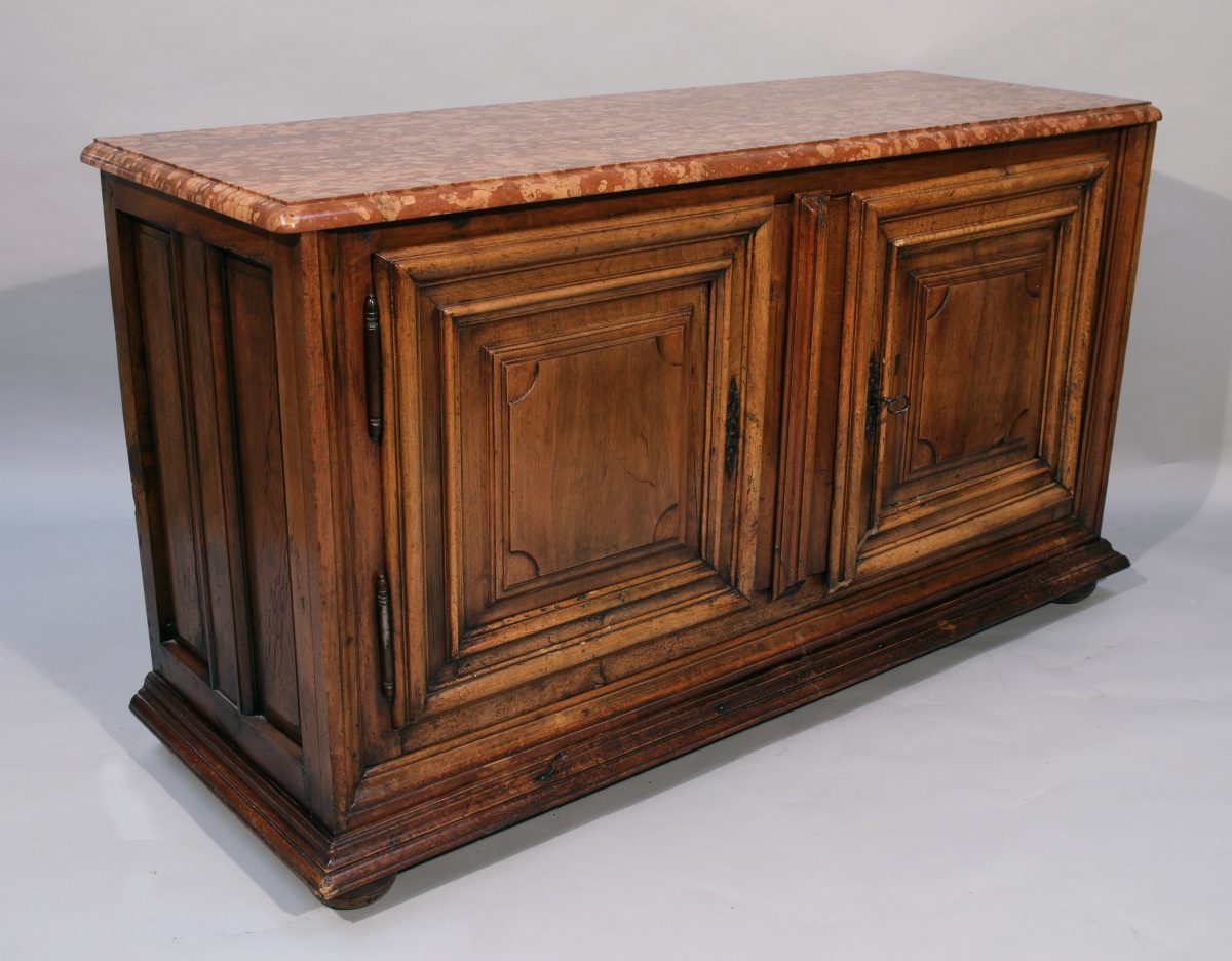 de forme rectangulaire ouvrant à deux portes en façade. Dessus de marbre brèche rosé. Il repose sur quatre pieds, les antérieurs en boule aplatie.
