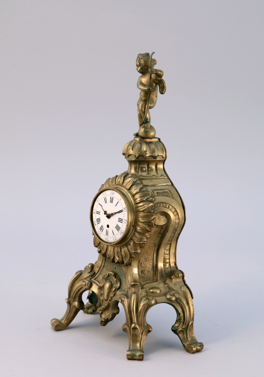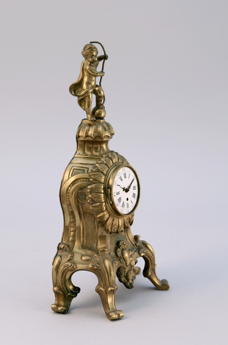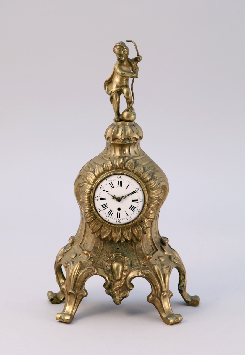 en bronze dans le gout de l'Horloge Astronomique livrée pour le roi Louis XV par Passement, dans une caisse de forme mouvementée surmontée d'un amour archer. Il repose sur quatre pieds feuillagés terminés par des enroulements. Cadran émaillé gradué pour les minutes, avec les heures en chiffres romains et gradués en chiffres arabes pour chaque période de 5 minutes (Diam. 54 mm).