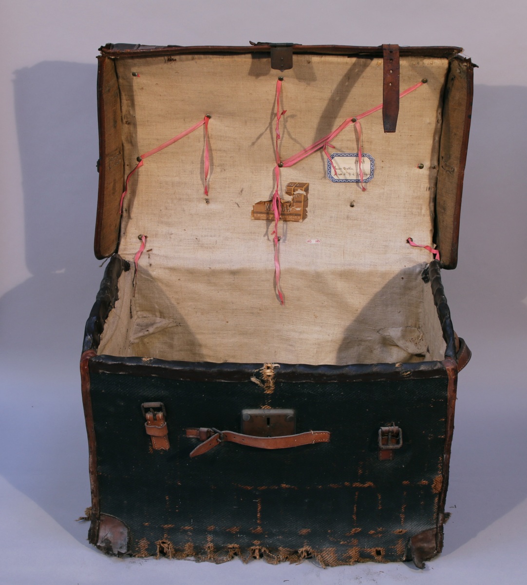 en osier recouvert de toile enduite et renforts de cuir. Monogrammée "VC" sur les côtés. Intérieur garni de toile. Fin XIXe - début XXe.