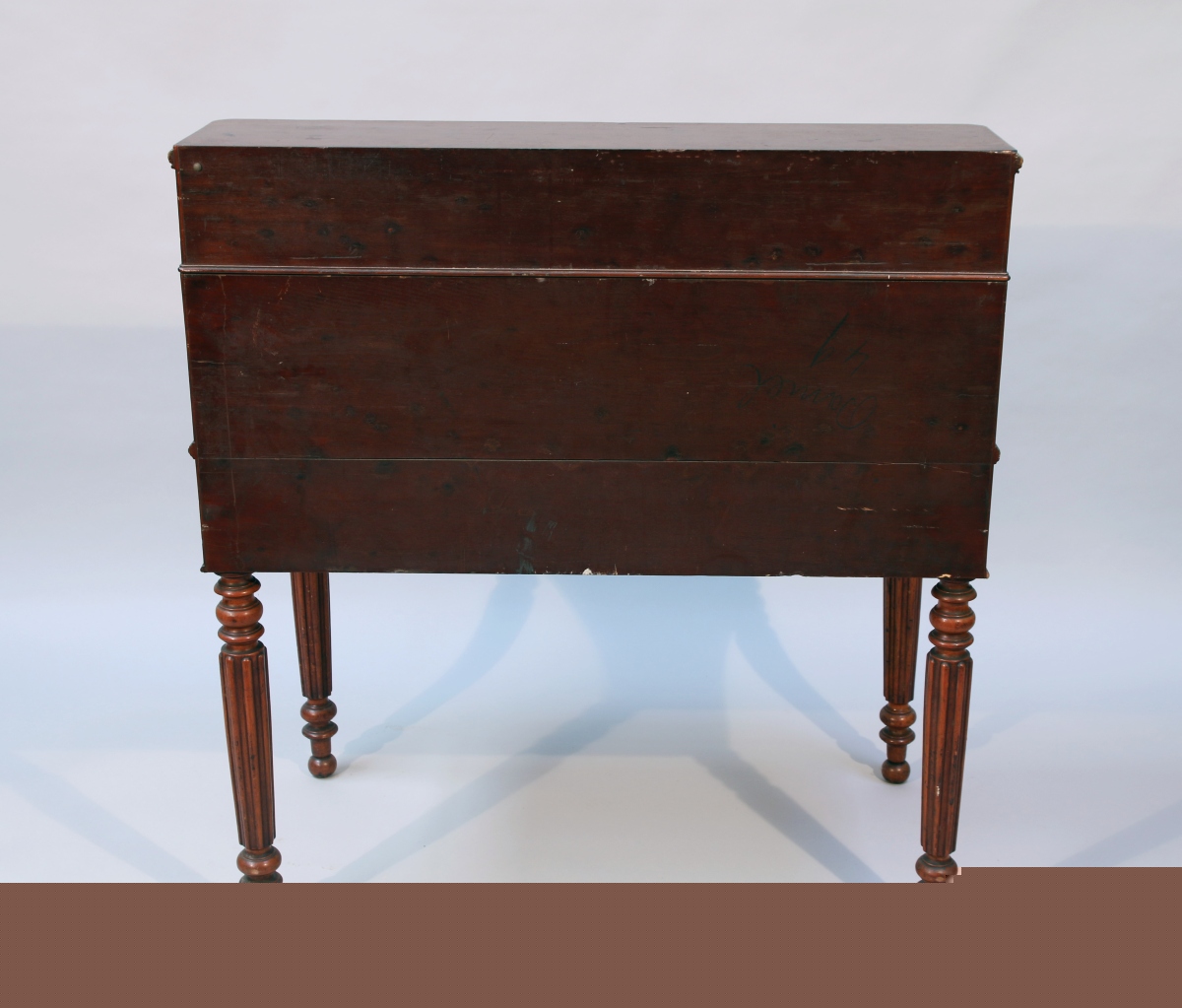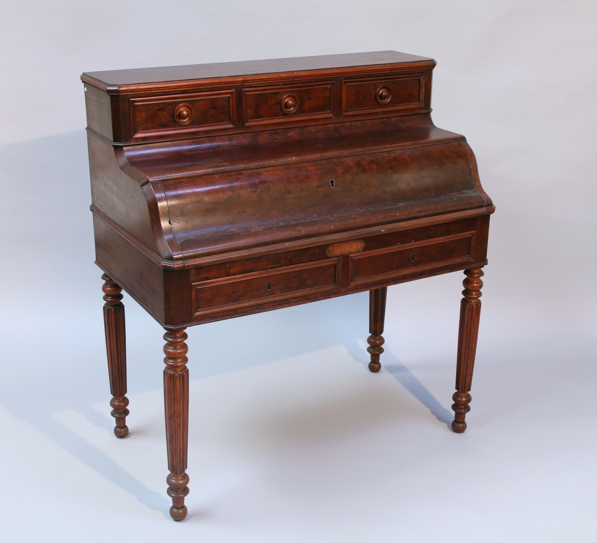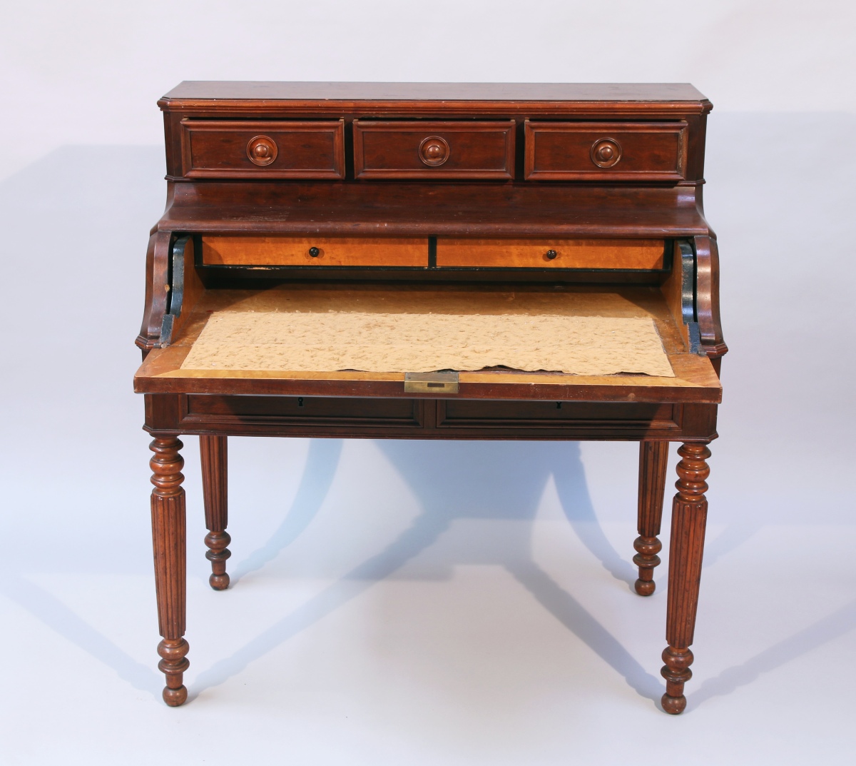 et placage d'acajou moucheté toutes faces. Il ouvre en façade par tiroirs dans le gradin, deux tiroirs en ceinture et un abatant formant tablette découvrant un intérieur en loupe d'orme à deux tiroirs. Il repose sur quatre pieds tournés et godronnés en noyer teinté.