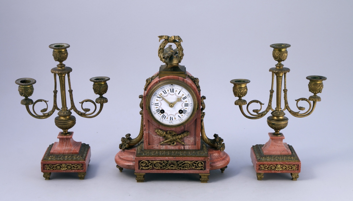 composé d'une pendule et d'une paire de candélabres en marbre rosé et bronze ciselé et doré.