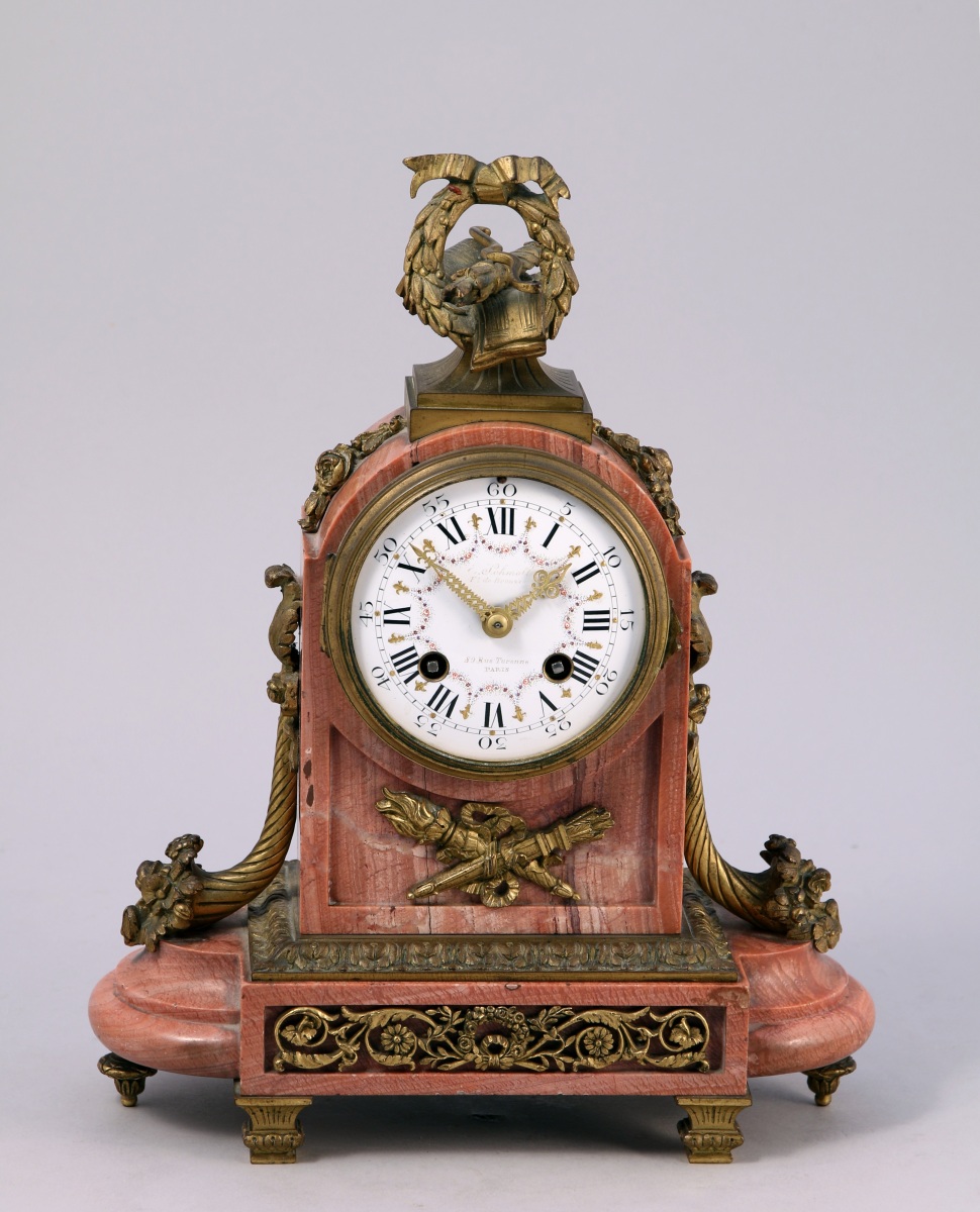 La PENDULE borne à base oblongue reçoit un riche décor tel que arc, carquois et partitions dans une couronne de lauriers à l'amortissement, guirlandes de fleurs, cornes d'abondances, frise d'acanthes et rinceaux ajourés. Elle accueille un cadran émaillé blanc agrémenté de guirlandes de fleurs polychromes et fleurs de lys or indiquant les heures en chiffres romains et les minutes en chiffres arabes. Il est signé "E. Schmoll / Ft de bronzes / 80 rue de Turenne / Paris". Elle repose sur six pieds, les deux antérieurs en balustre, les quatre postérieurs en toupie.