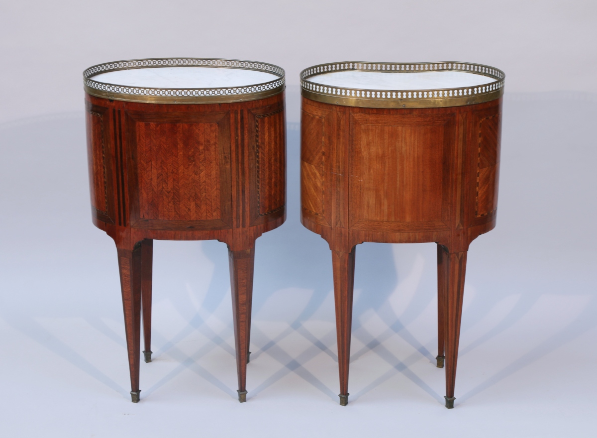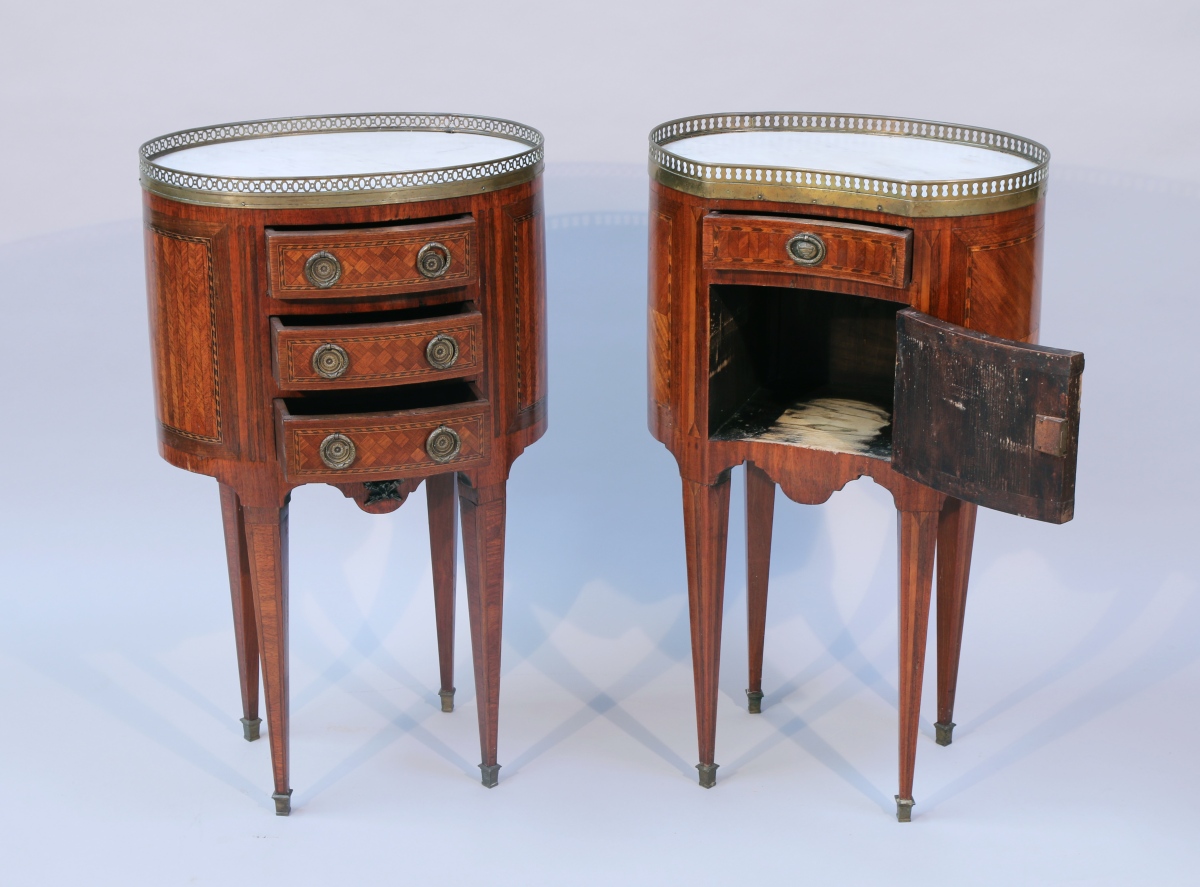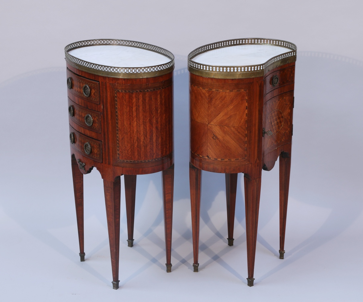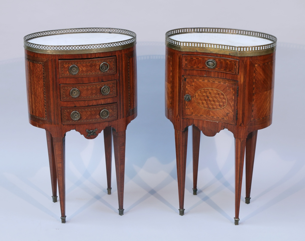 Plateau de forme elliptique pour l'un et rognon pour l'autre, en marbre blanc veiné gris, cerclé d'une galerie ajourée en laiton. La façade ouvrant sur trois tiroirs pour l'un et sur un caisson et un tiroir pour l'autre. Ceinture chantournée. Garniture de bronzes tels que entrées de serrure, anneaux de tirage et sabots. Ils reposent sur quatre pieds gaine.