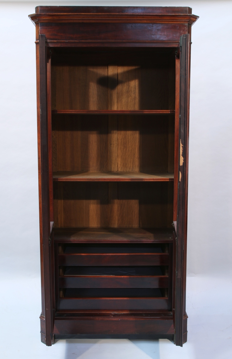 et placage d'acajou, ouvrant à deux portes vitrées à léger décrochement en partie haute. L'intérieur composé de trois étagères et trois tiroirs en partie basse. Montants à pans coupés. Corniche à légère doucine. Elle repose sur quatre petits pieds. Milieu du XIXe.