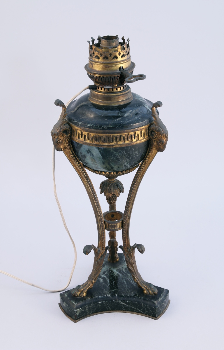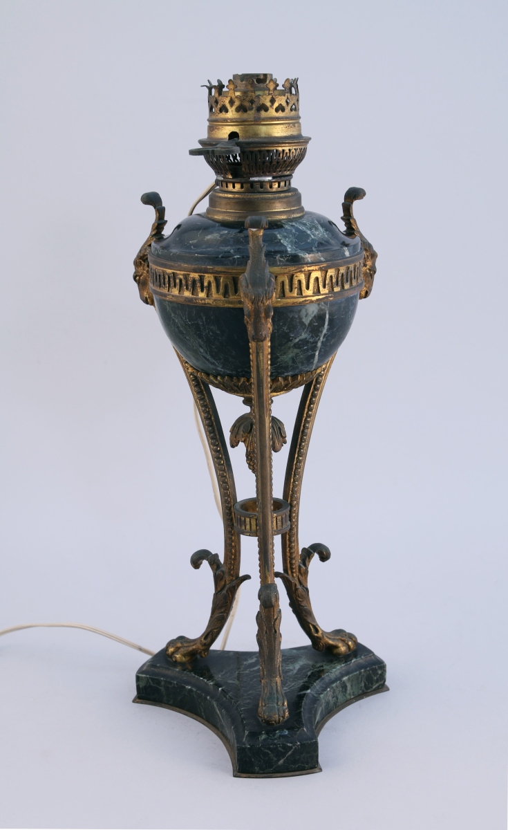 Le réservoir en marbre vert Maurin est orné au culot d'une pomme de pin en bronze. Elle repose sur un piètement tripode en bronze doré surmonté de têtes de béliers coiffées d'une feuille d'acanthe et terminé par des pattes de lions. Base en marbre. Électrifiée.