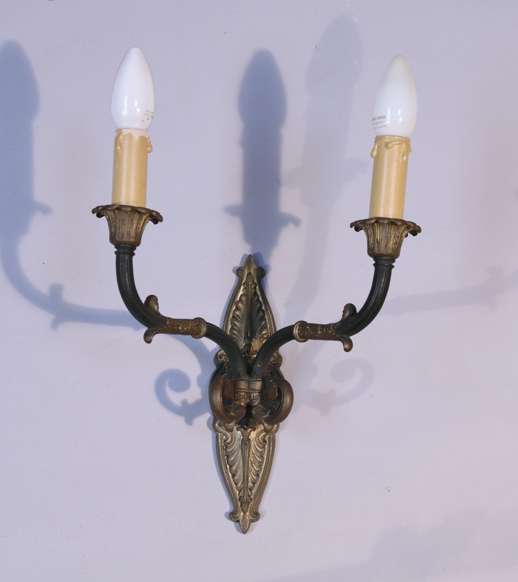patiné et doré à deux bras de lumière naissant d'un fleuron flanqué de deux palmettes lancéolées. En "S", ils sont ornés d'un enroulement et d'acanthes stylisées. Binet en fleur épanouie godronnée.