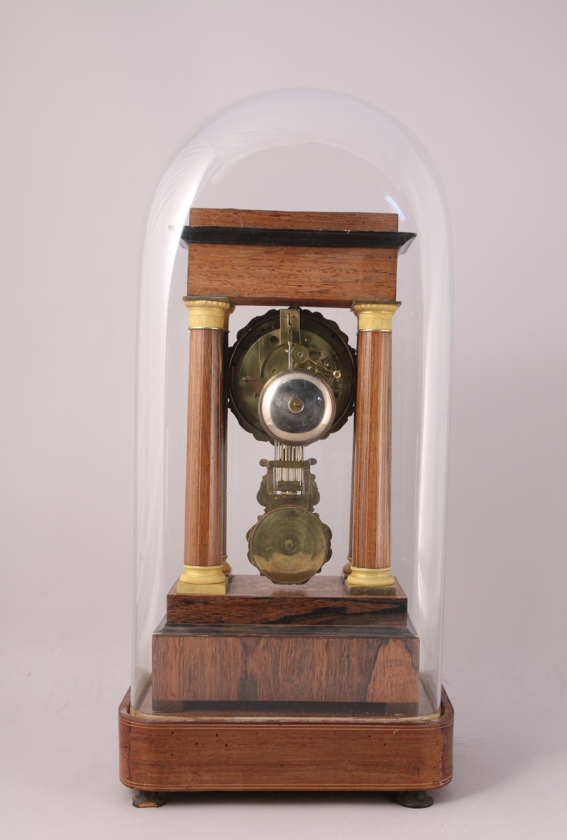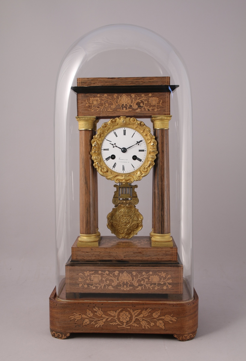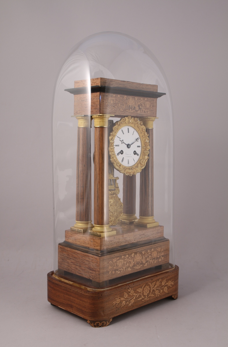 sombre marqueté de motifs feuillagés et filets de bois clair. Garniture de bronzes ciselés et dorés tels que bases et chapiteaux des colonnes, pourtour du cadran et balancier. Cadran émaillé blanc indiquant les heures en chiffres romains signé "Trouzeix / à Clermont Fd". Mouvement à plaque. Avec un socle au décor similaire muni de son globe.