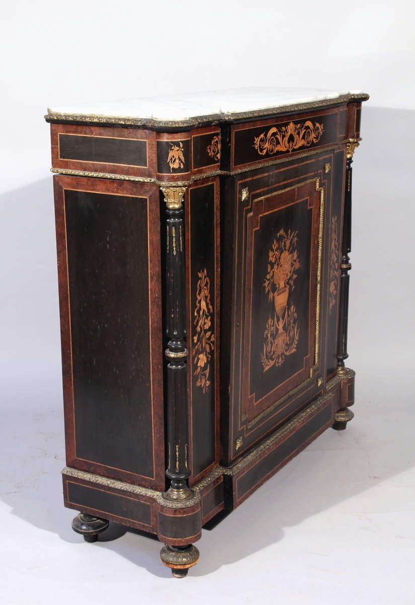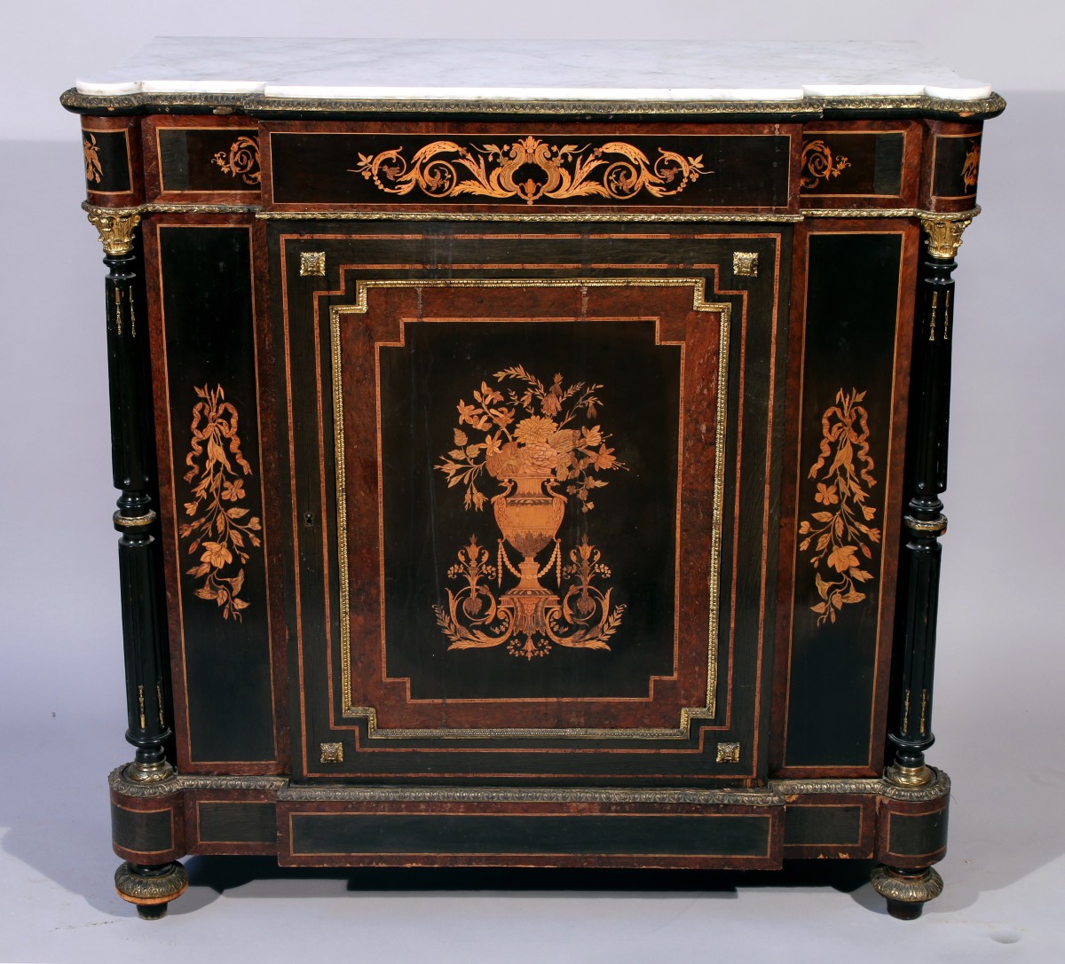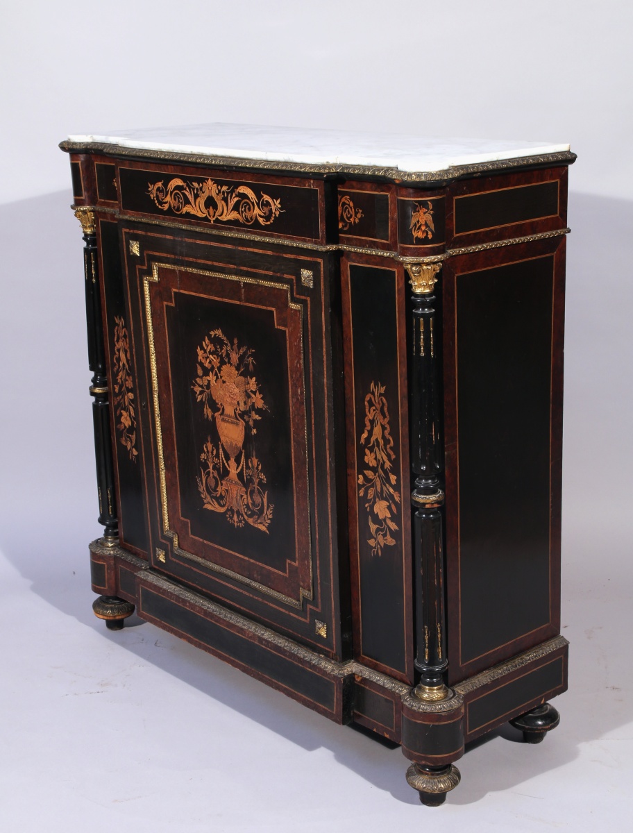 loupe et filets de bois clair ouvrant en façade par un vantail en ressaut. Ce dernier orné d'une riche marqueterie figurant un vase fleuri, flanqué de bouquets de fleurs rubanés. Montants à colonnes en balustres superposées détachées, cannelées et rudentées. Ornementation de bronzes ciselés et dorés tels que frises, chapiteaux, asperges, écoinçons fleuronnés et bagues. Le plateau est foncé d'un marbre blanc. Le meuble repose sur quatre pieds toupies.