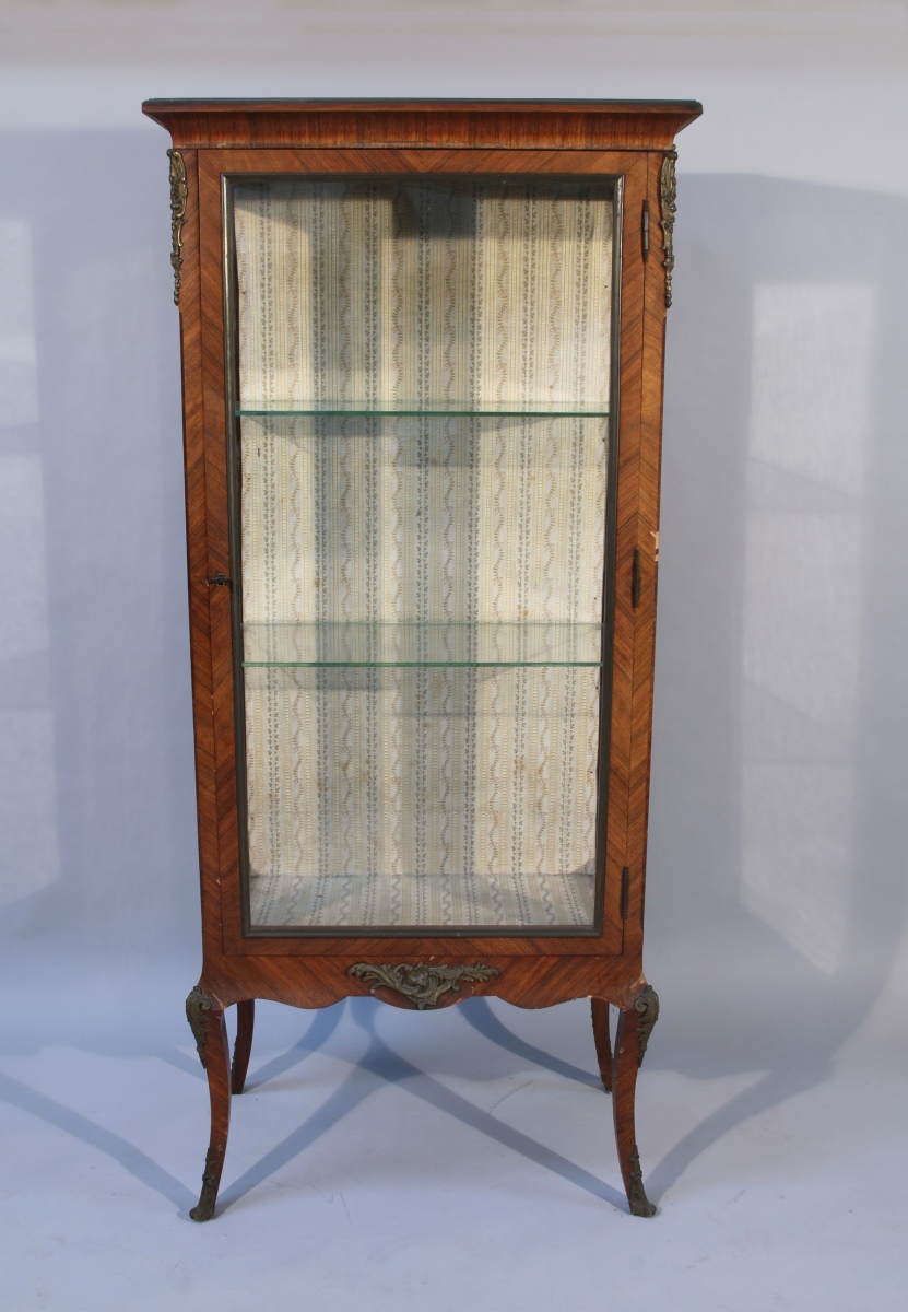ouvrant à une porte vitrée découvrant deux étagères. Les côtés vitrés. Ornementation de bronzes de style rocaille. Elle repose sur quatre pieds cambrés.