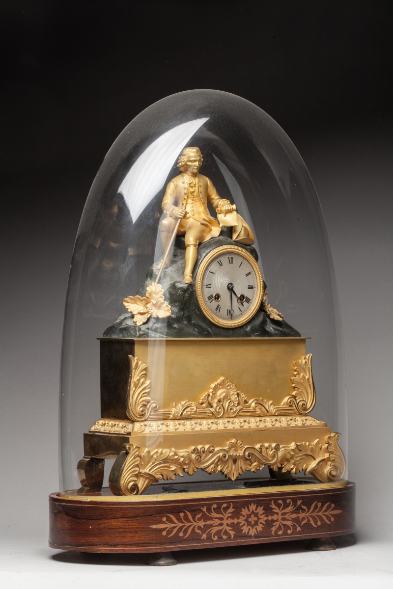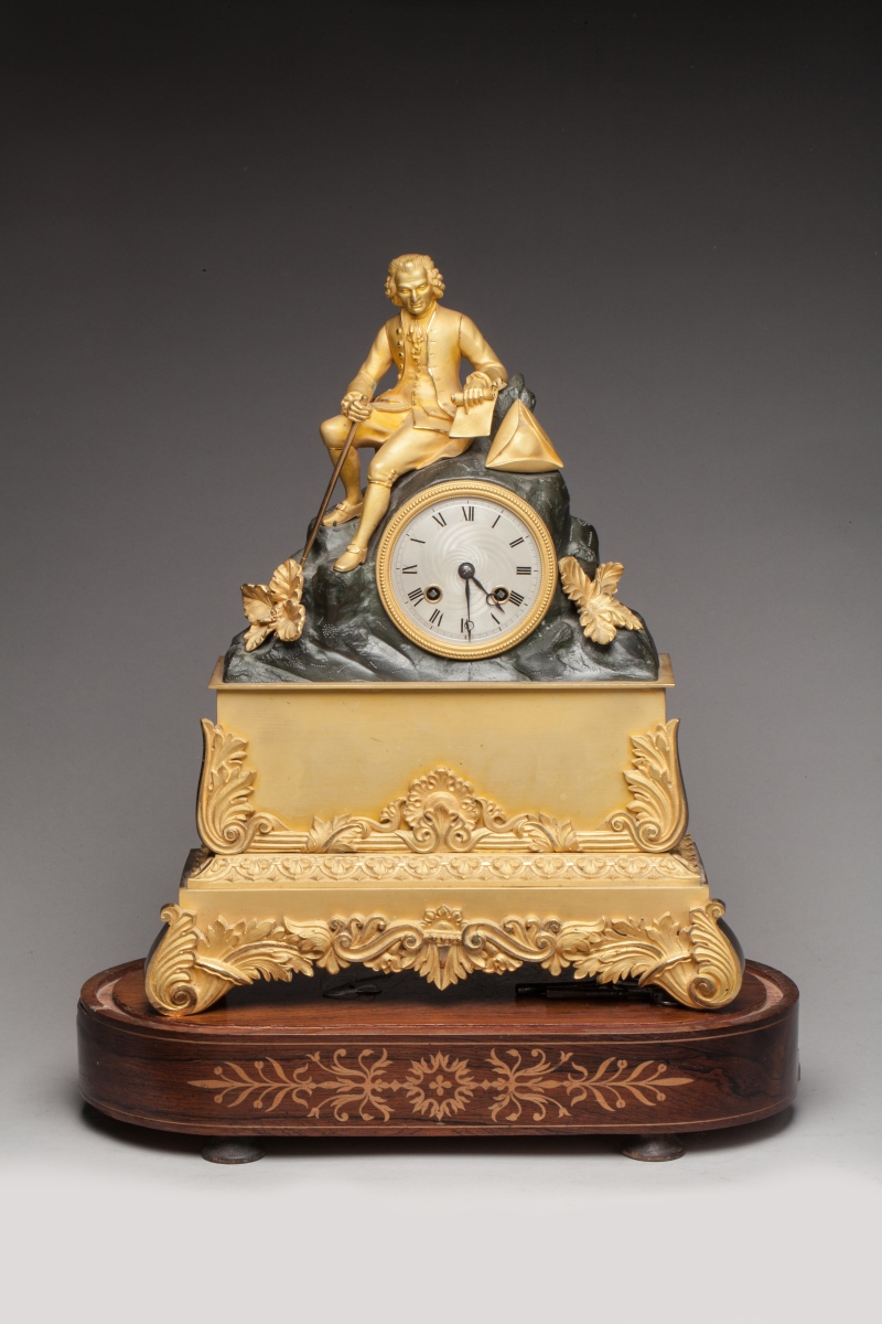 dite borne, en régule doré et patiné et en laiton figurant Jean-Jacques Rousseau assis, bâton de marche et rouleau manuscrit à la main, son chapeau tricorne posé sur les rochers. Le cadran métallique ondoyé est marqué des heures en chiffres romains et gradué pour les minutes. Elle repose sur un socle de forme rectangulaire à motifs d'acanthes sur une base à doucine ceinte d'une frise de lotus reposant sur quatre pieds à acanthe et frises feuillagées. Mouvement avec suspension à fil.