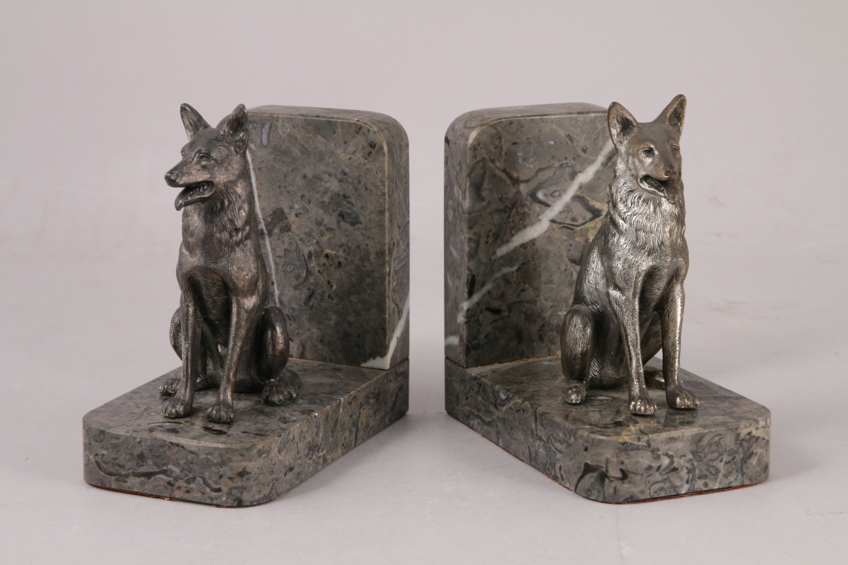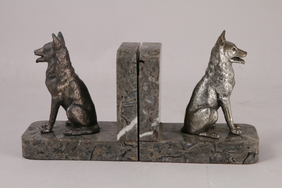 à patine argentée figurant un berger allemand assis. Socle en marbre gris veiné blanc. XXe.