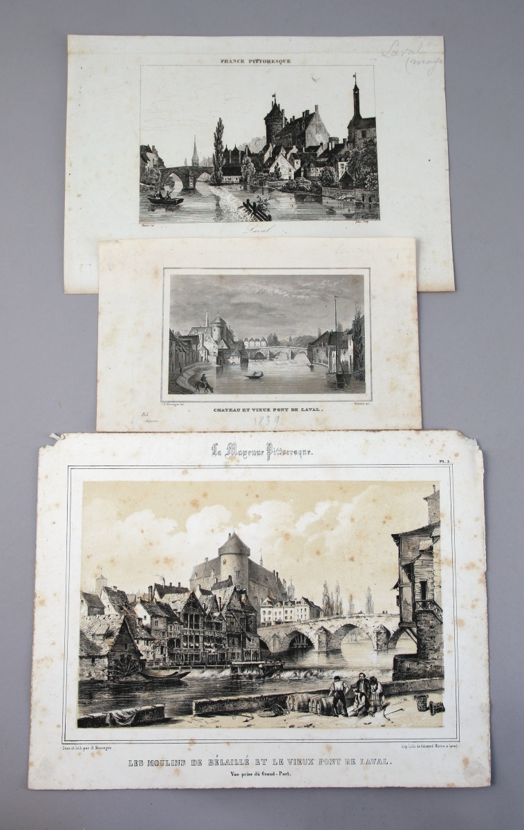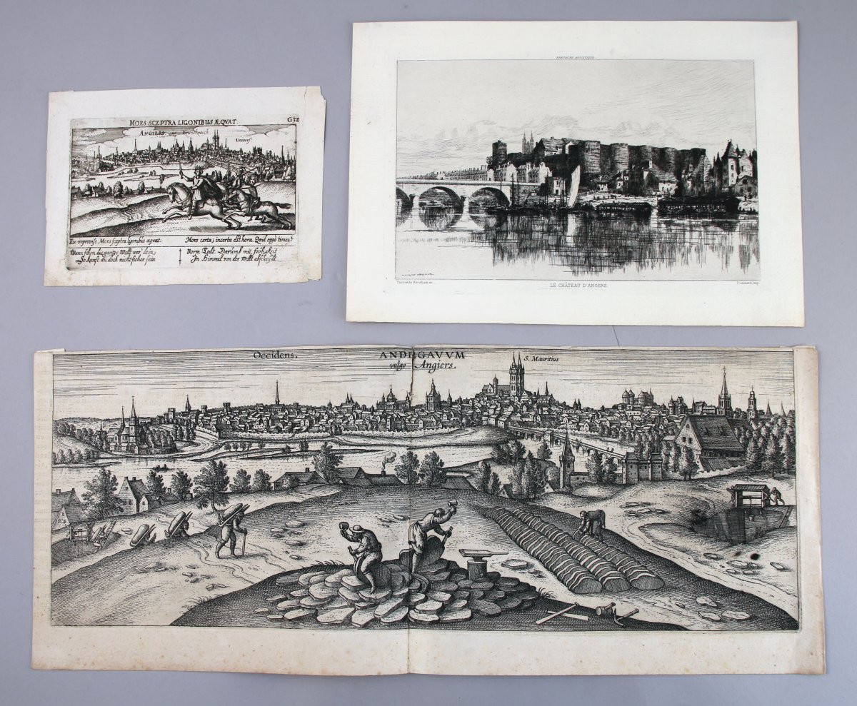 Réunion de 12 MULTIPLES dont: Retour de chasse au château de Brissac; Ancienne vue d'Angers; Ancienne vue d'Angers "Mors Sceptra Ligonibus Aequat"; Vues de Laval; Costumes de Mayenne; etc.