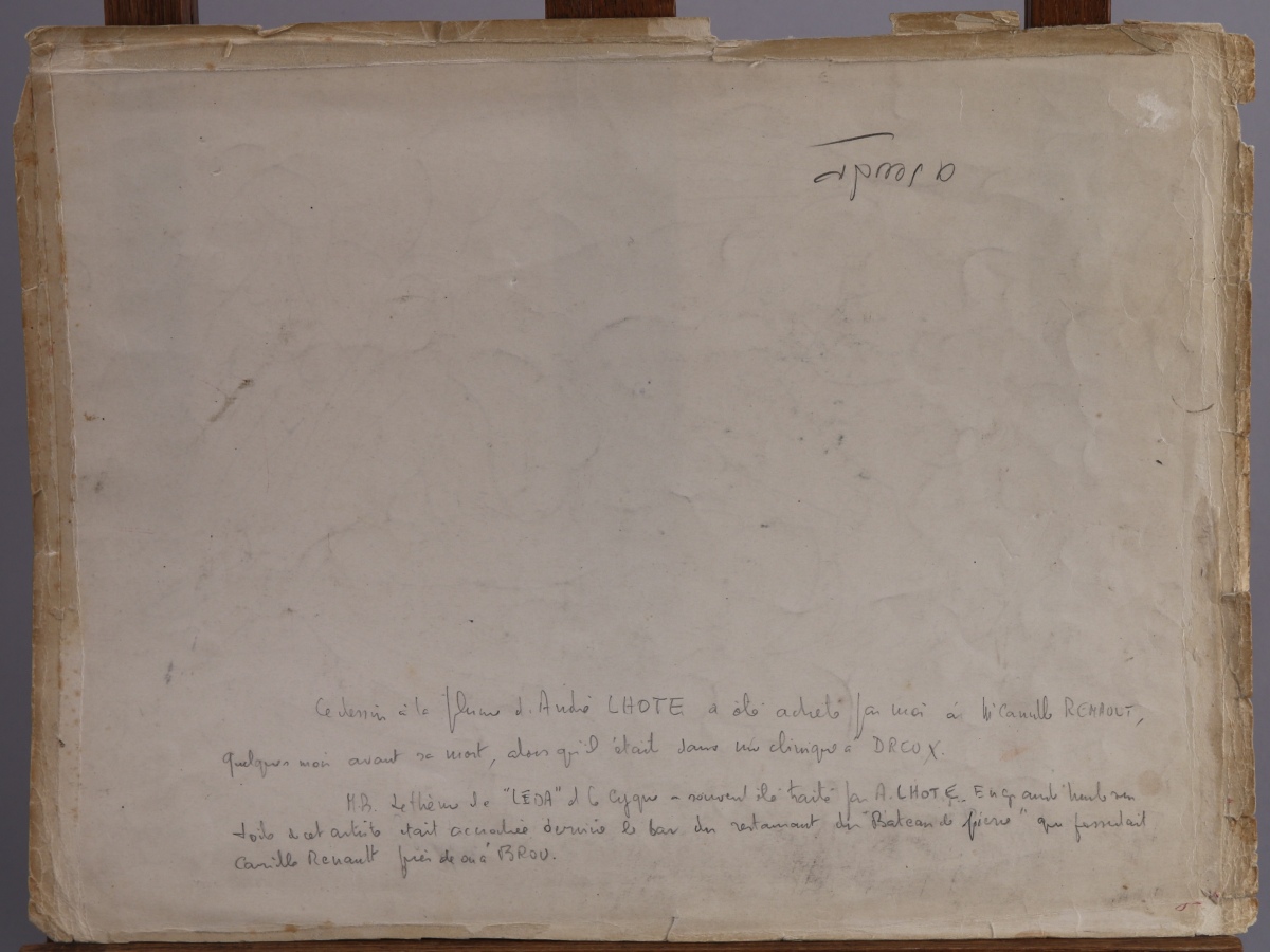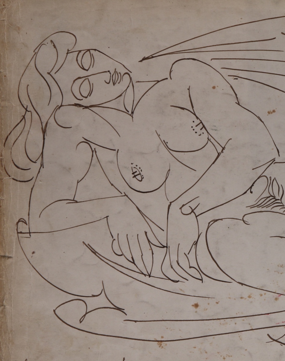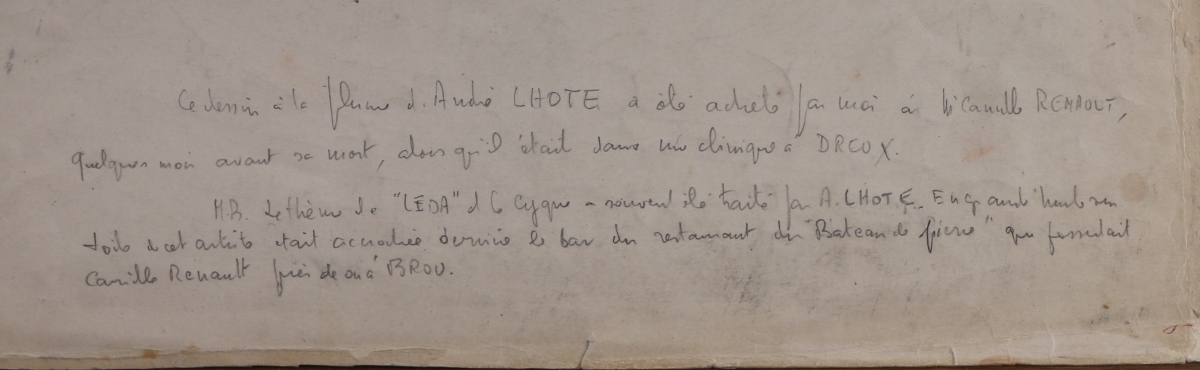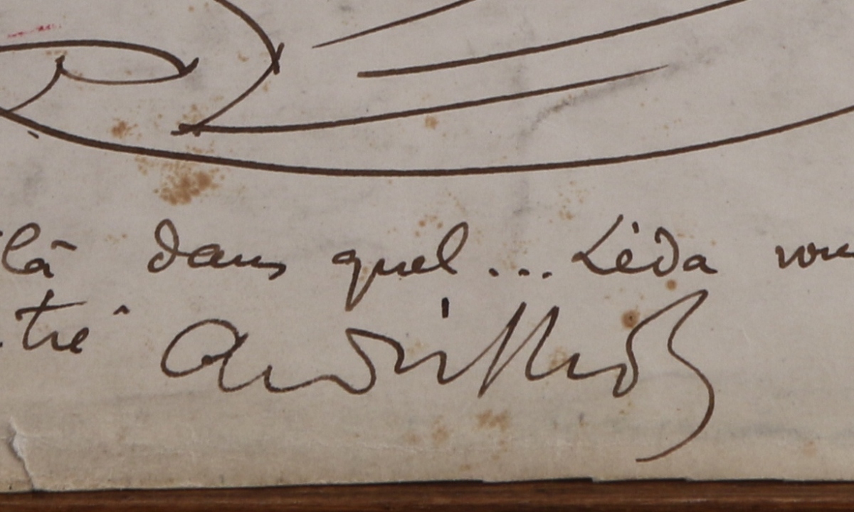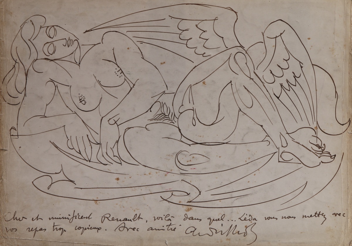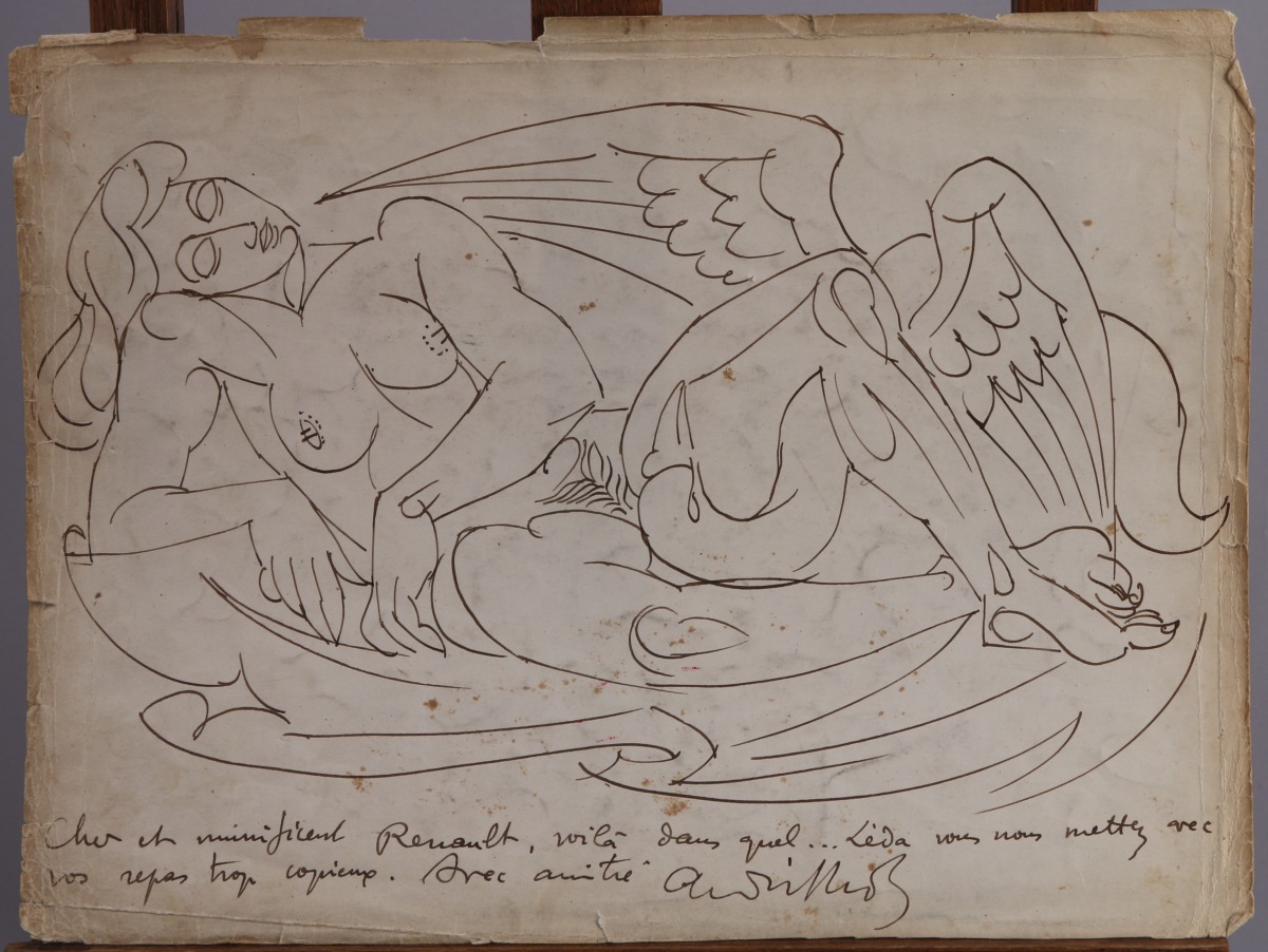 Encre dédicacée: "Cher et munificent Renault, voilà dans quel... Léda vous nous mettez avec vos repas trop copieux. Avec amitié" et signée.