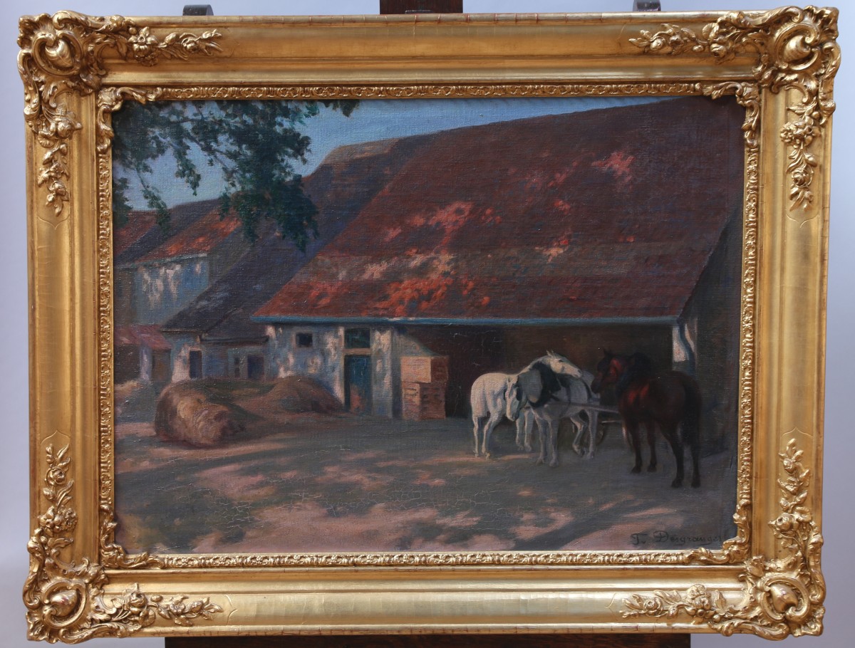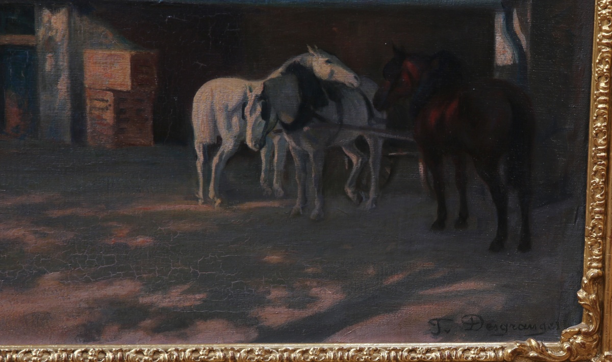Félix DESGRANGES (1860-1942)Relais de postes, chevaux au repos.Toile signée en...